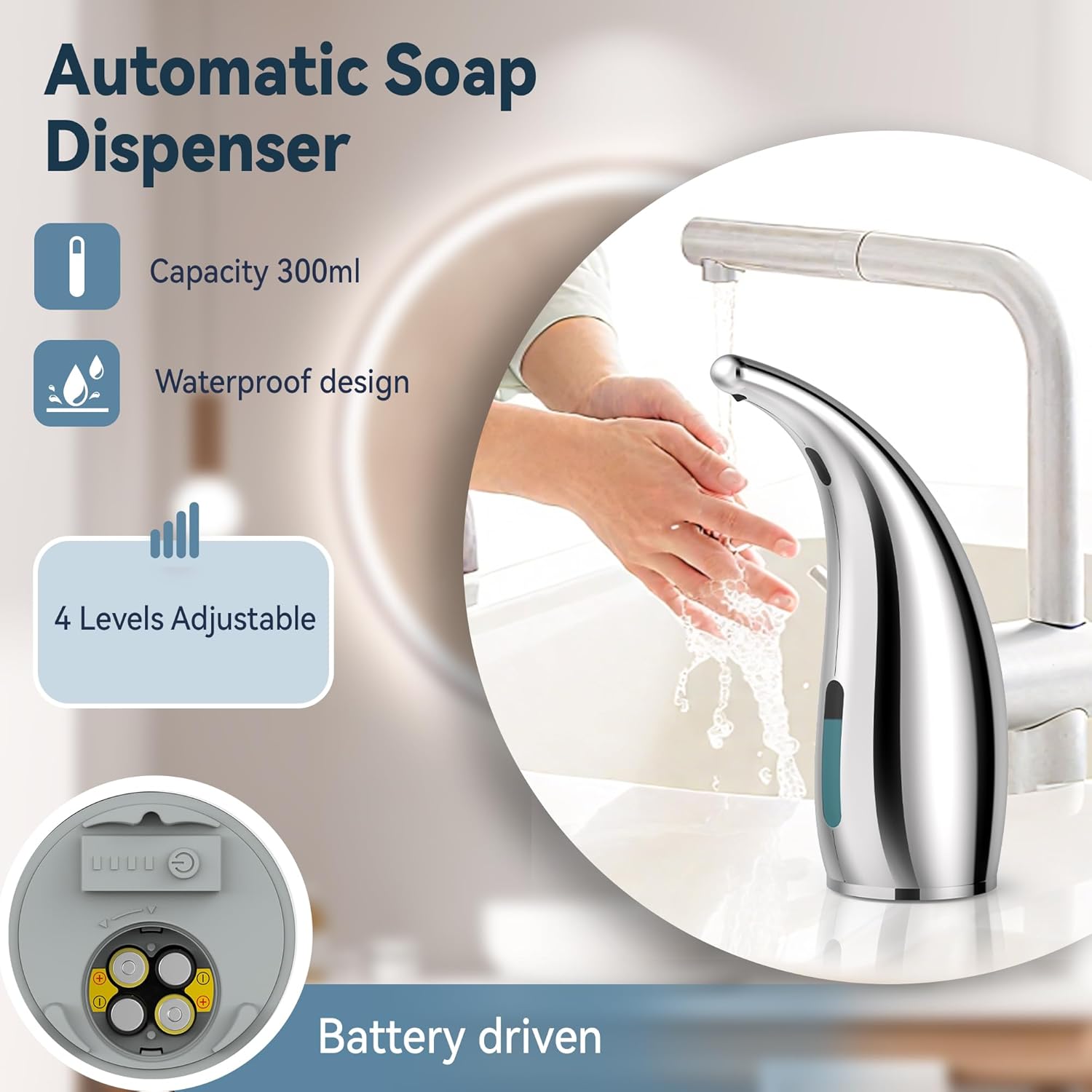 Automatic Soap Dispenser with Infrared Sensor - Adjustable 4-Level Touchless Hand Soap for Kitchen, Bathroom - Battery Operated Electric Dispenser, Durable Plastic, Smart Soap Holder (Silver)