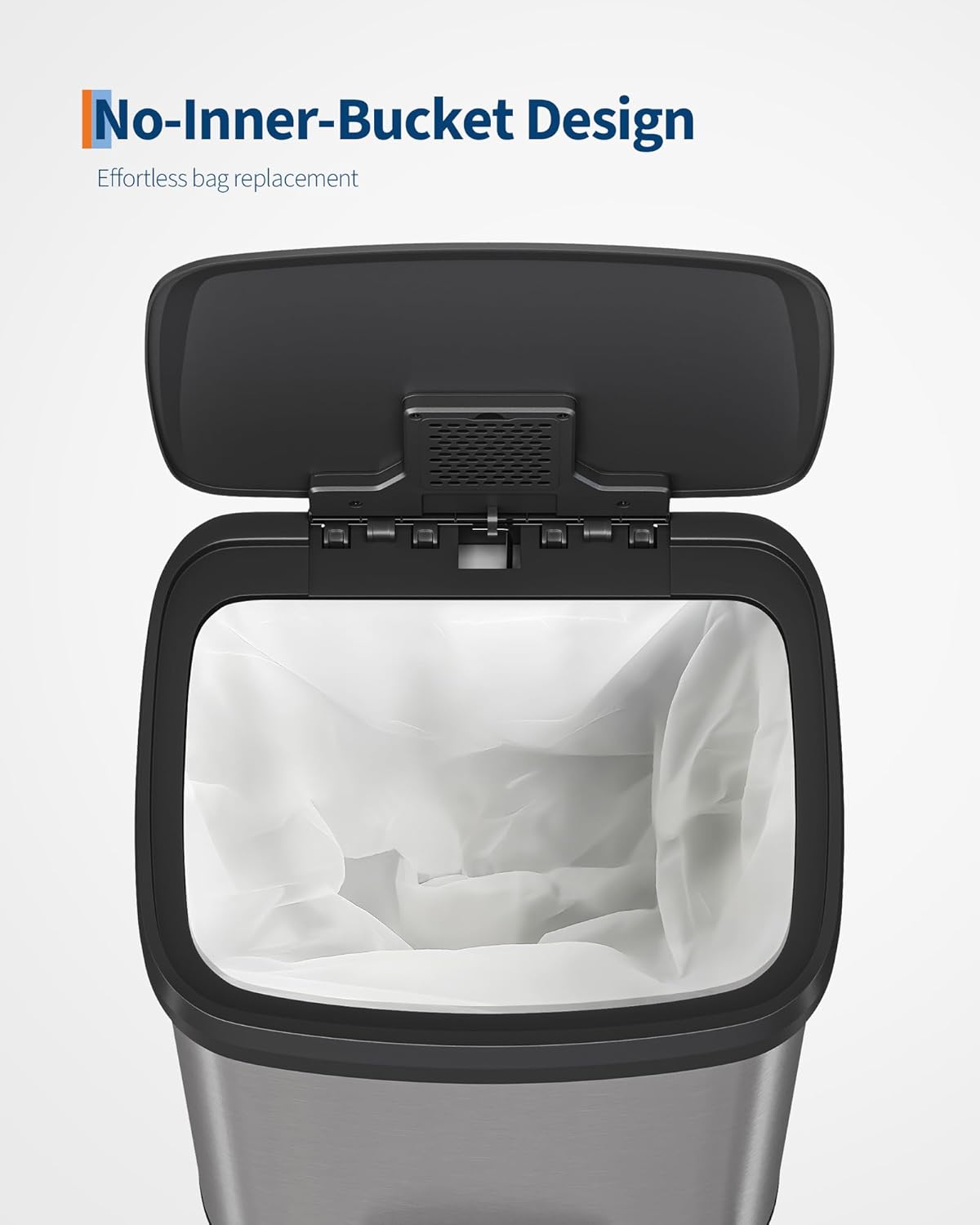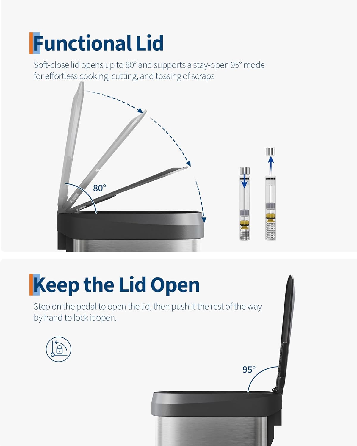 • [PRACTICAL DESIGN] – The Garvee's tall step-on kitchen trash can prioritizes ease of use with an ergonomic rear handle for effortless lifting and relocation. The soft-close lid opens smoothly to 80° without hitting island edges and locks at 95° for hands-free cooking prep and scrap disposal. The integrated liner rim secures any standard bag snugly to prevent slips, bunching, or overhang