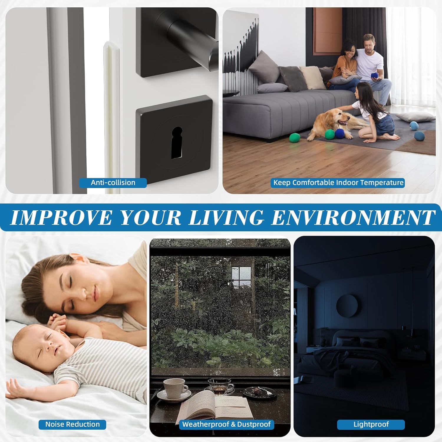 • Multi-Purpose Design: This window insulation is the perfect solution for sealing gaps around doors and windows with ease. Whether it’s winter or summer, our door weatherstripping acts as a reliable barrier to lock in hot or cold air—boosting heating and cooling efficiency while cutting down on energy bills. What’s more, it effectively blocks out noise, light, rain, dust, wind, leaves, snow, and odors, and even keeps unwanted pests from sneaking in.