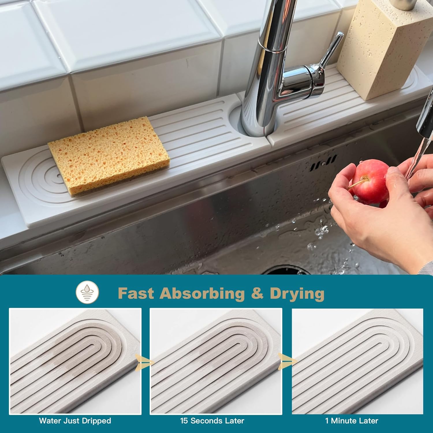 • Drying Fast: Our Faucet mat for kitchen sink is crafted from natural diatomacues earth. The diatomite stone's small holes enable amazing water absorption, quickly soaking up splashes and self-drying within minutes. Say goodbye to annoying drips and keep everything dry.