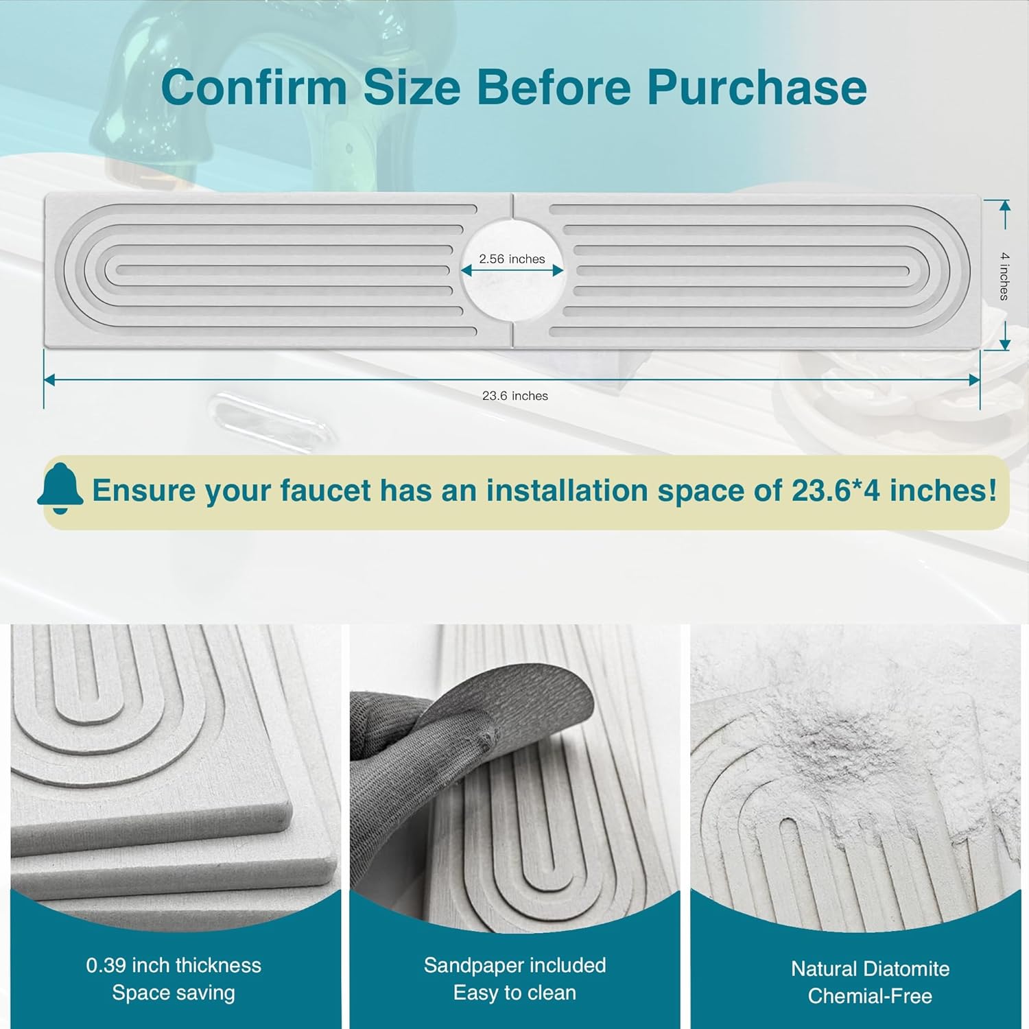 • Notice: Based on the product size, make sure the stone won’t cover any sink buttons or dispensers; Faucet-to-wall distance must be over 0.72"; Faucet base diameter must be under 2.5". | Size: 23.6" x 4" x 0.4", with a 2.56" center hole. NON-CUTTABLE HARD STONE MAT.
