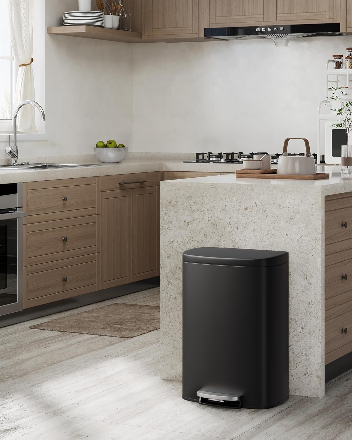 • [MINIMAL FORM, EXQUISITE DETAIL] – The Garvee powder coated metal kitchen trash can boasts a fingerprint-resistant finish that wipes clean in seconds. The thick lid with extended overhang lip conceals bag edges for a seamless profile, while anti-slip rubber feet keep the bin firmly in place on tile, hardwood, or low-pile carpet
