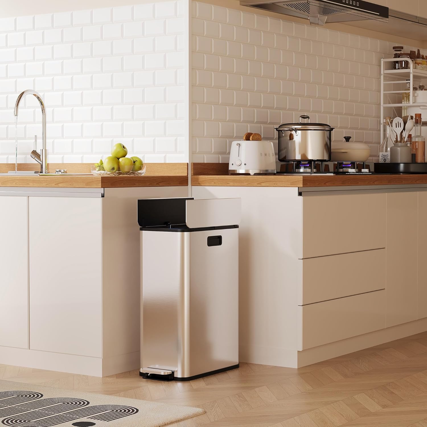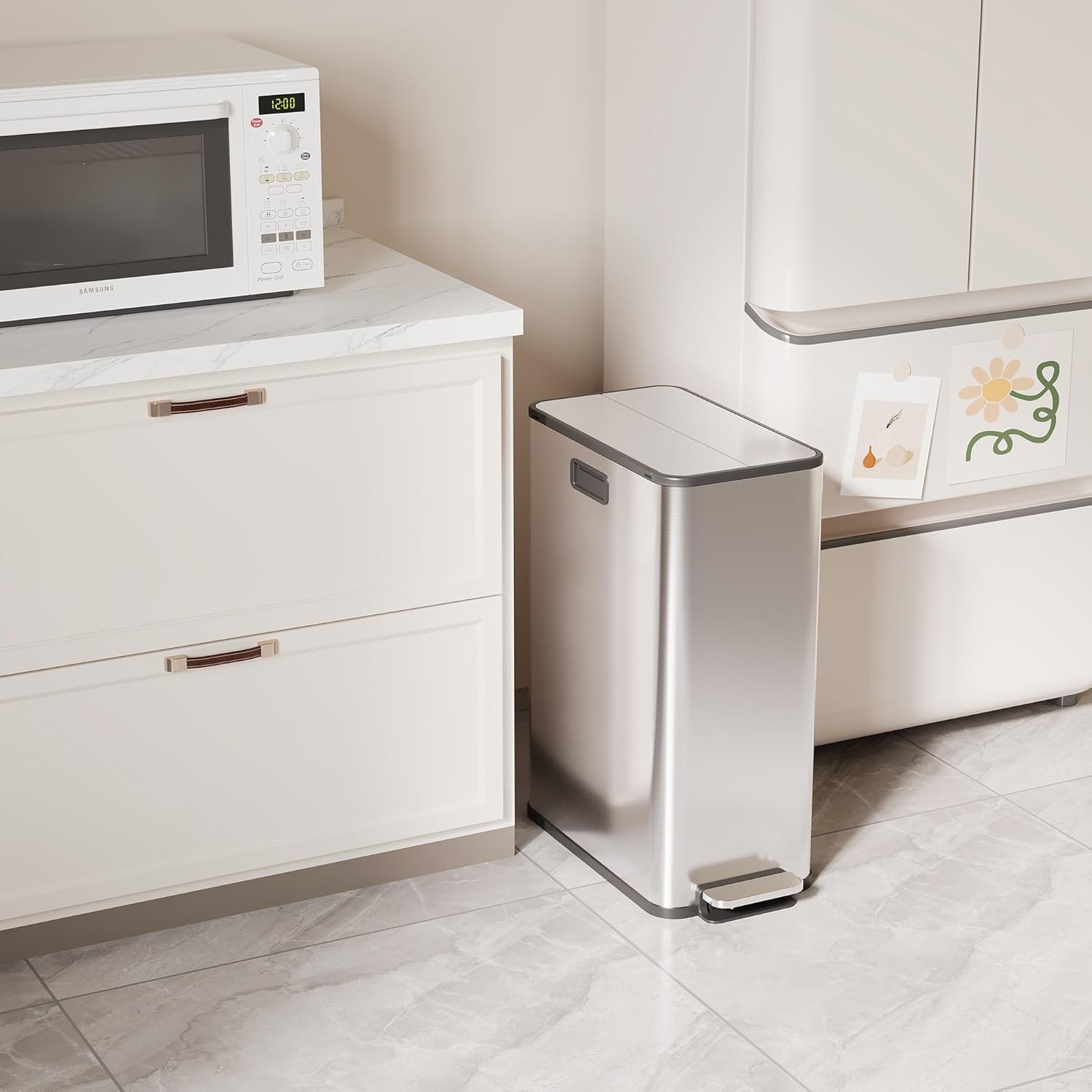 • Sleek and Easy to Maintain: Featuring an anti-fingerprint stainless steel finish, this trash bin not only enhances your kitchen's aesthetic but also simplifies cleaning. Keep your kitchen looking pristine without the hassle of frequent clean