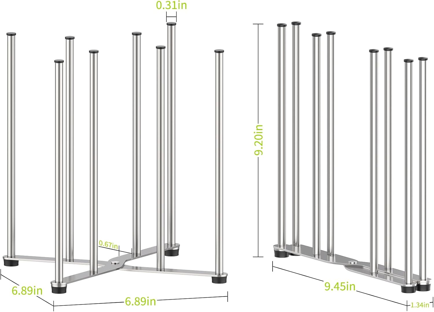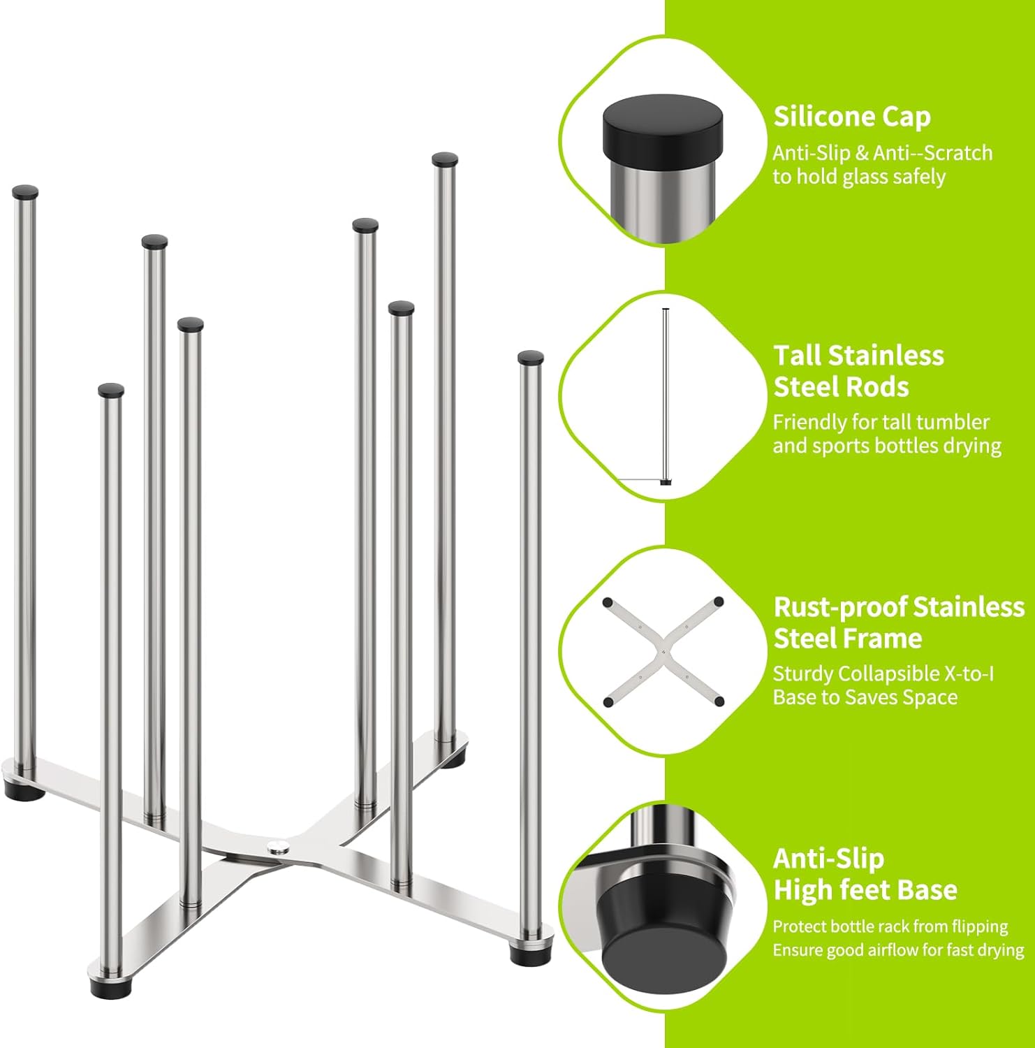 • 【Large Capacity & Tall Enough】:Dries up to 8 botlles at once -Effiicient bottle drying rack to hold and dry water bottles, travel bottles, gallon-sized reusable bags, jars, cutting boards and more. Sturdy 10 inches steel rods provide ample height for dying tall tumblers & large baby bottles and ensure sufficient airflow for faster drying – saving counter space without clutter.