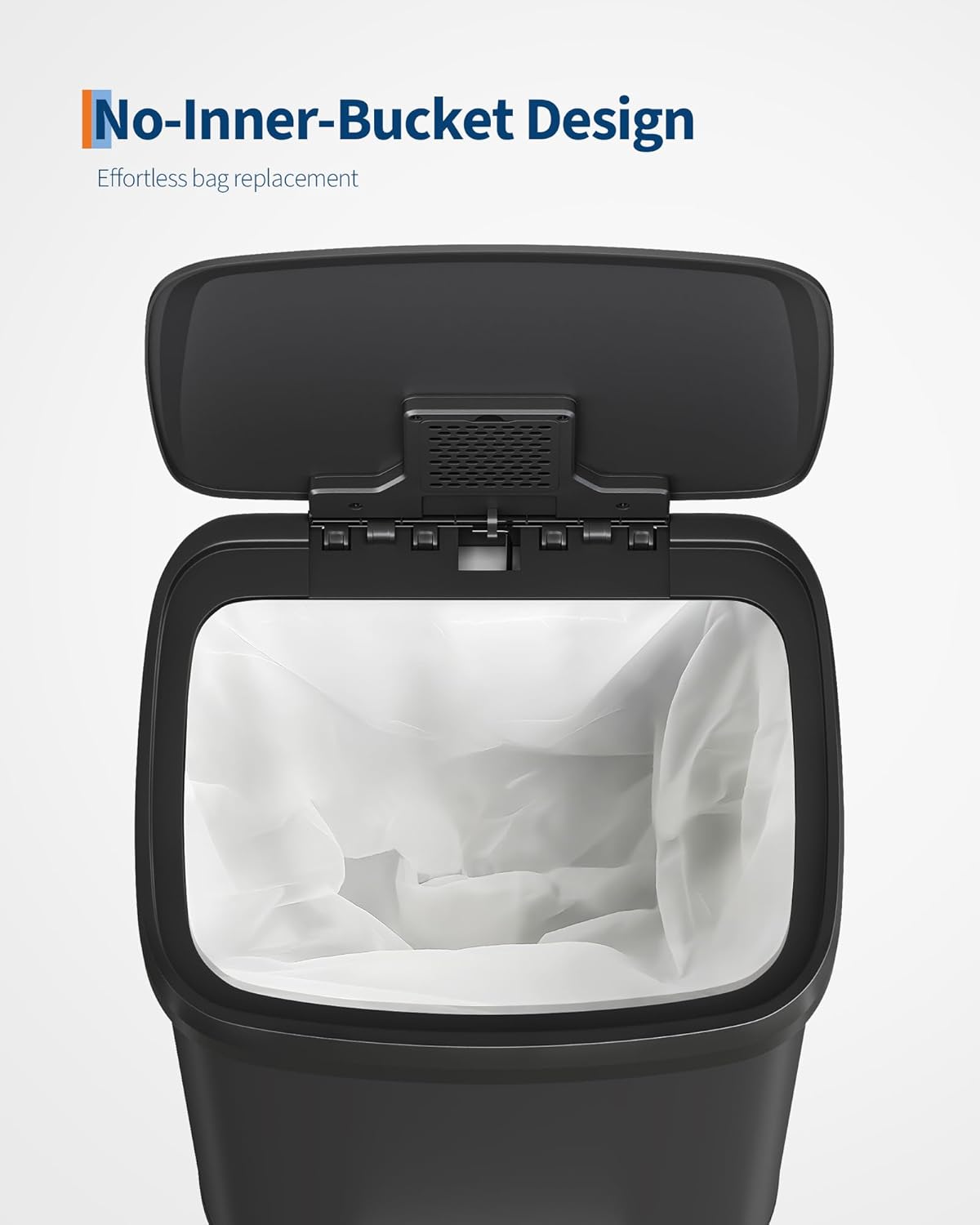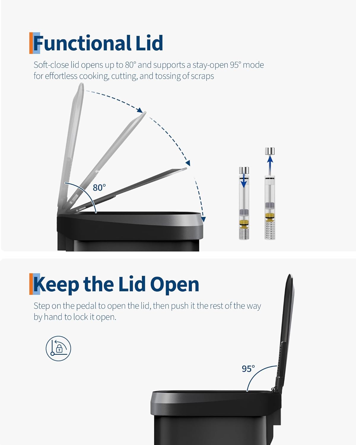 • [PRACTICAL DESIGN] – The Garvee’s tall step-on kitchen trash can prioritizes ease of use with an ergonomic rear handle for effortless lifting and relocation. The soft-close lid opens smoothly to 80° without hitting island edges and locks at 95° for hands-free cooking prep and scrap disposal. The integrated liner rim secures any standard bag snugly to prevent slips, bunching, or overhang