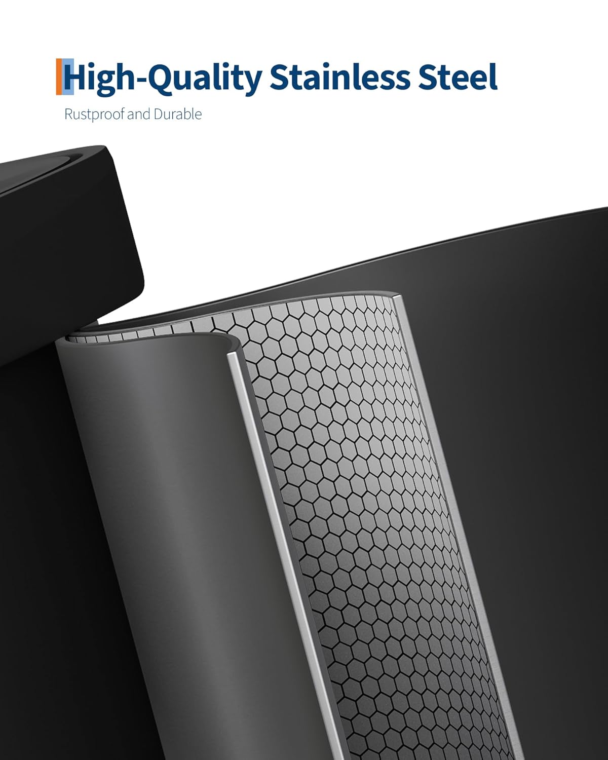 • [HIGH-QUALITY MATERIALS] – The Garvee large trash can with lid is engineered for longevity. Its powder coated metal shell resists rust, scratches, and maintains lasting luster. A thick ABS lid stands up to dents, stains, odors; its industrial steel pedal endures 150,000+ steps and the one-piece ABS hinge survives over 300,000 open/close cycles