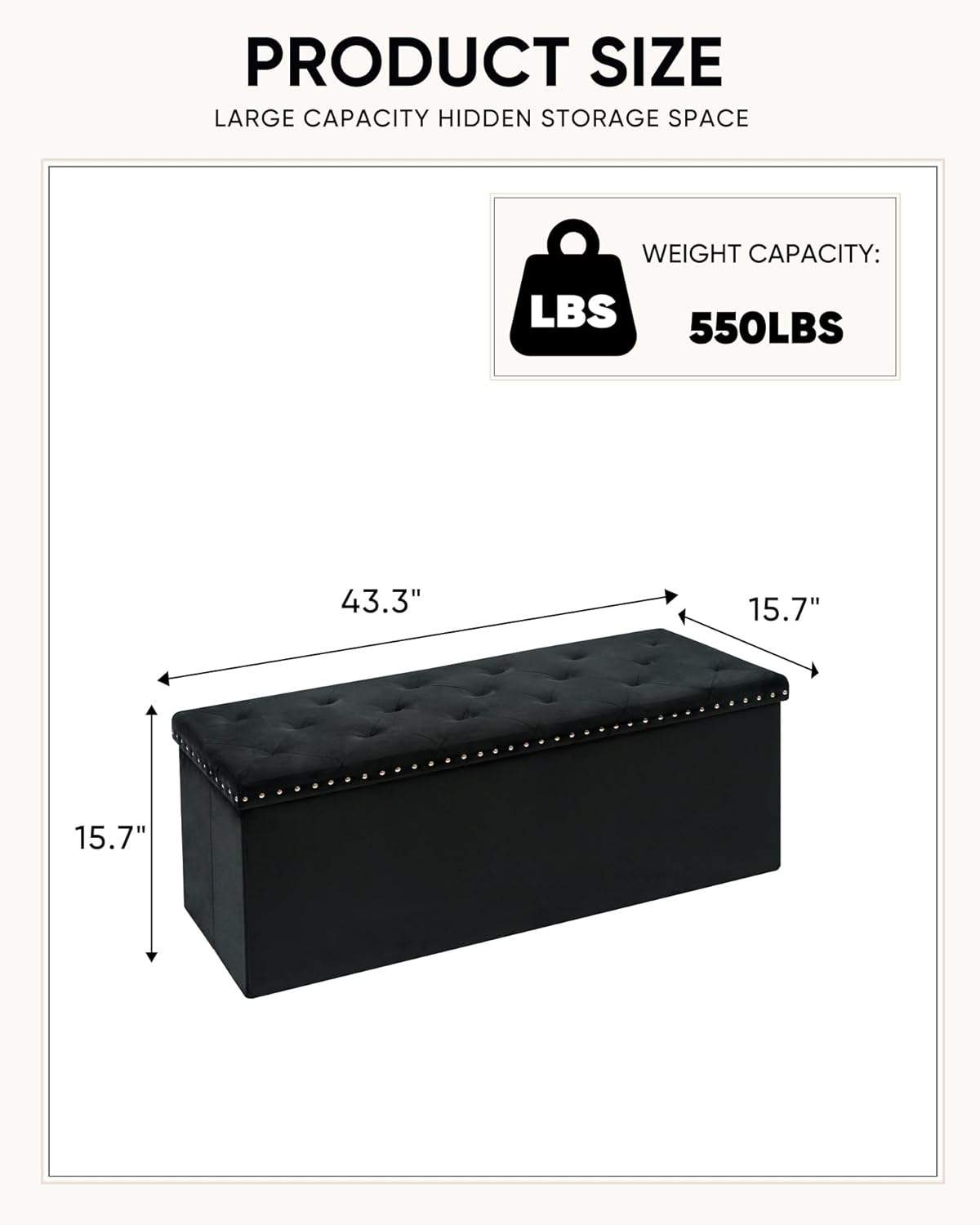 Velvet Storage Ottoman Bench, 43.3" Folding Ottoman with Rivet Trim, Heavy-Duty Upholstered Entryway Bench, Sturdy Footrest and Seat for Bedroom, Living Room, Holds up to 660 LBS, Black