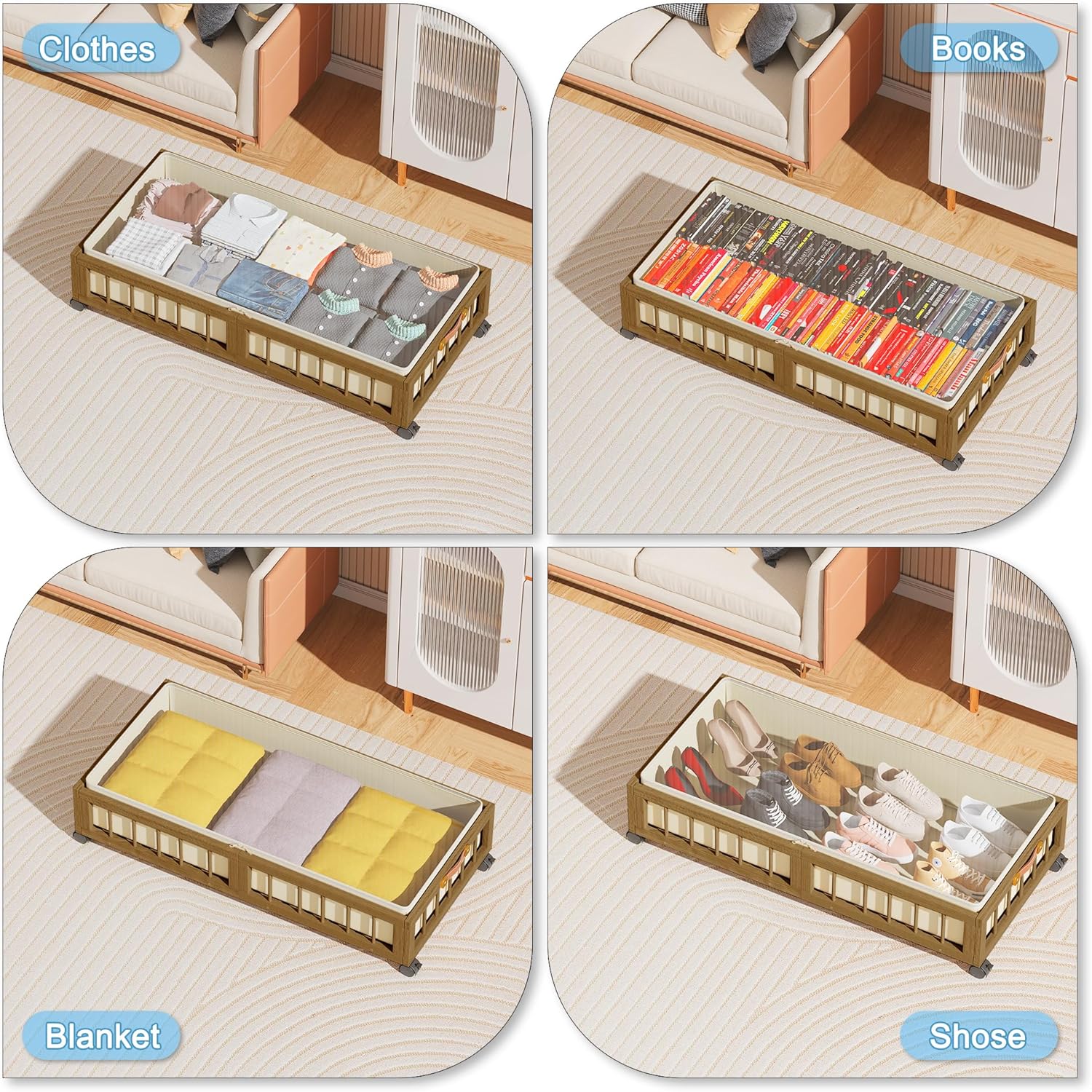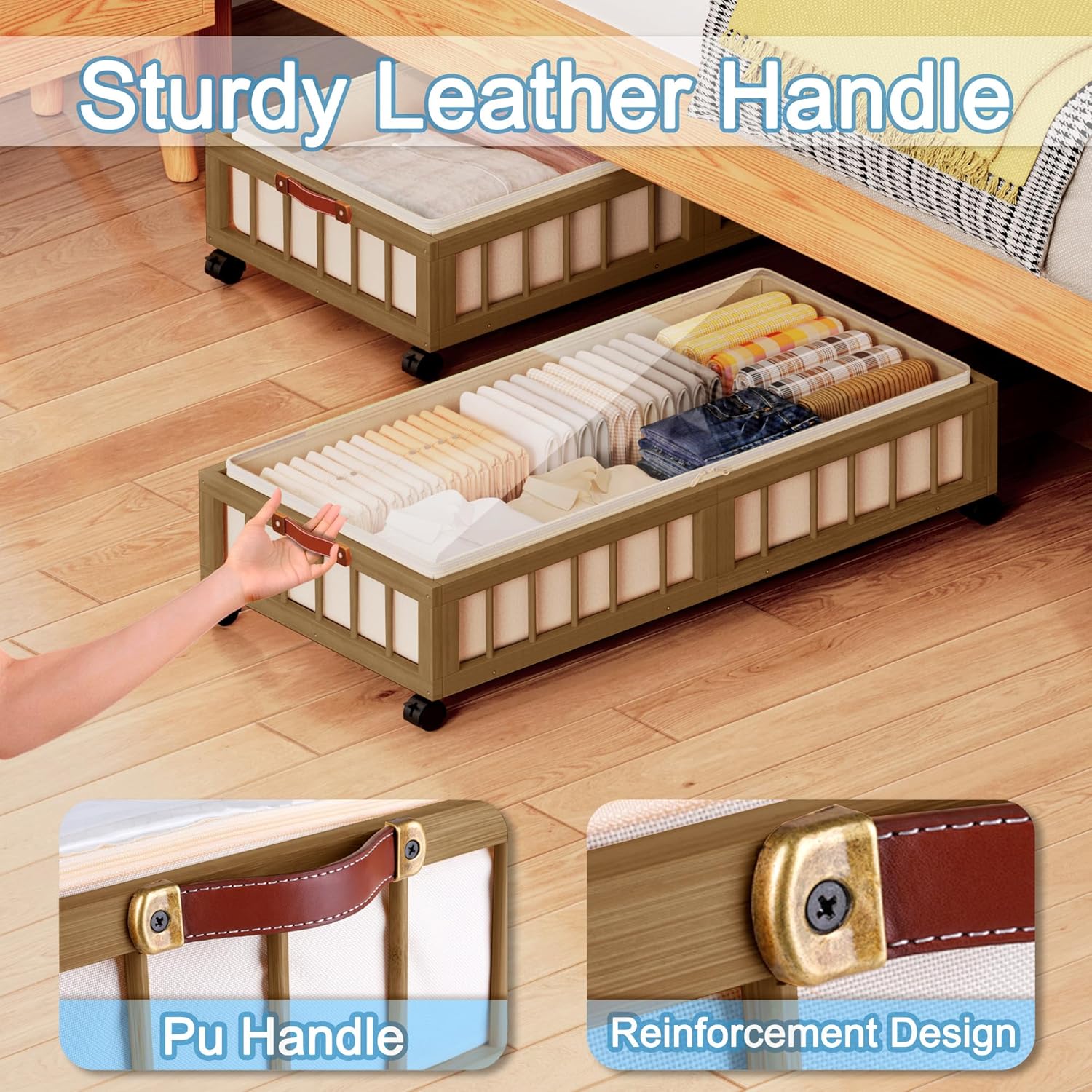efluky 2-Pack Bamboo Under Bed Storage with Wheels, Rolling UnderBed Storage Basket with Large Dust Bag, Under Bed Storage Containers for Bedroom, Dorm and Basement, Brown