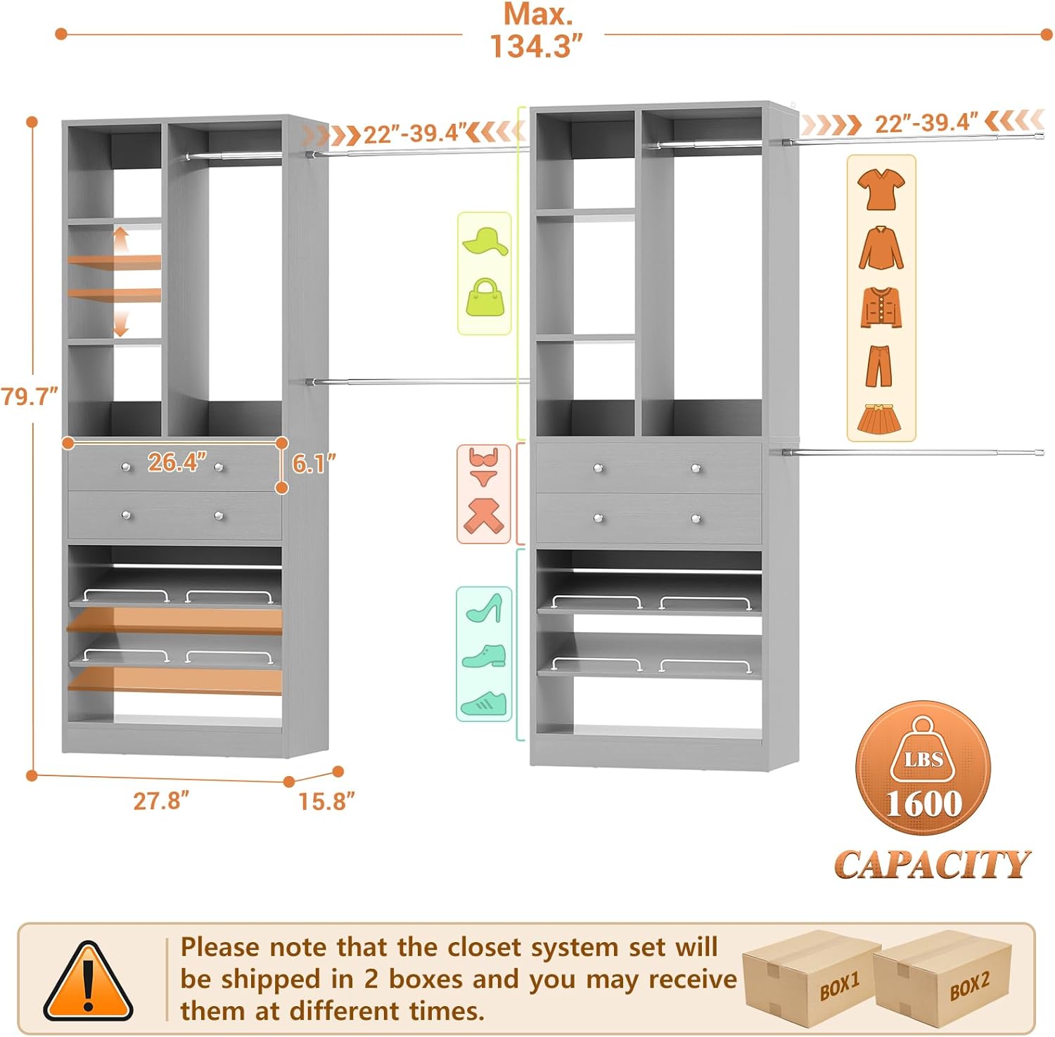 Closet System, Up to 134"/11.2 FT Closet Organizer with 4 Wooden Drawers and Shelves, Walk-in Closet System with 6 Hanging Rods, Built-in Closet Can Fit 96"/8FT, 120"/10FT, Morandi Grey