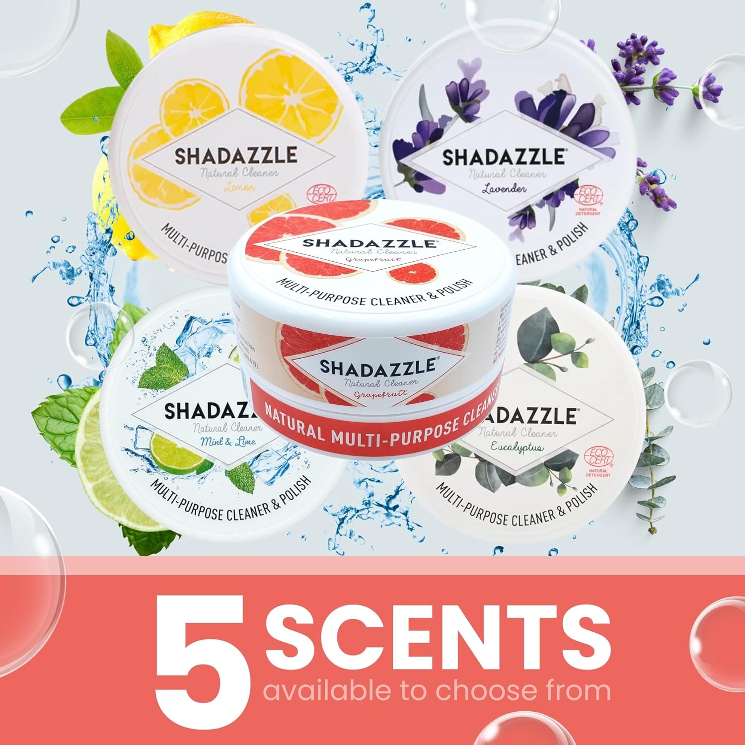 • NATURAL ALL PURPOSE CLEANER : Shadazzle is a multi purpose cleaner that works on any washable surface. It is made with natural ingredients only : clay, vegetal oil, vegetal glycerin, grapefruit fragrance. No harmful chemicals or phosphates !