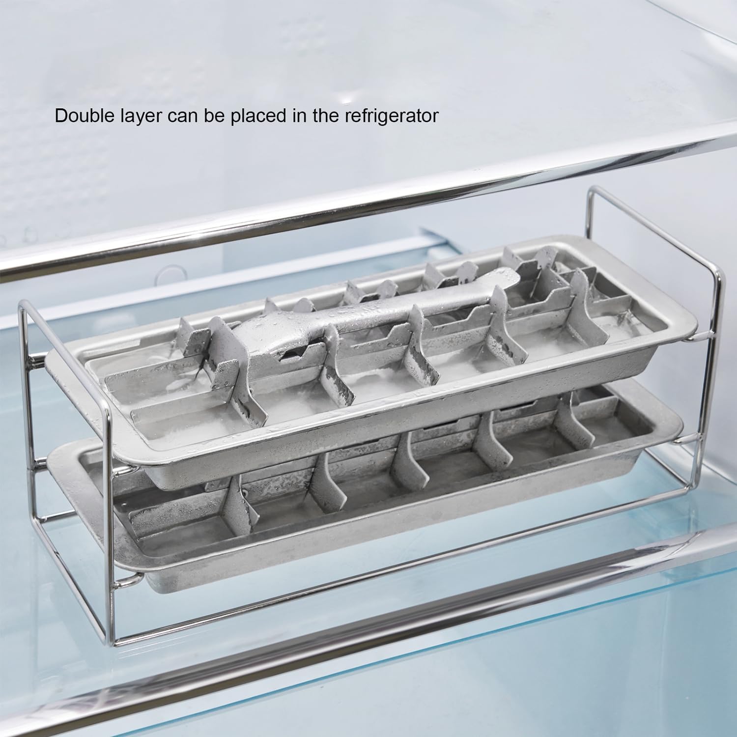 • ICE CUBE TRAYS SET: This two-piece ice cube freezer tray with lever comes with a tray and dividers (hammer and tweezers included), the dividers in the tray can make 18 individual ice cube molds. This stainless steel ice cube mold is durable, green and reusable