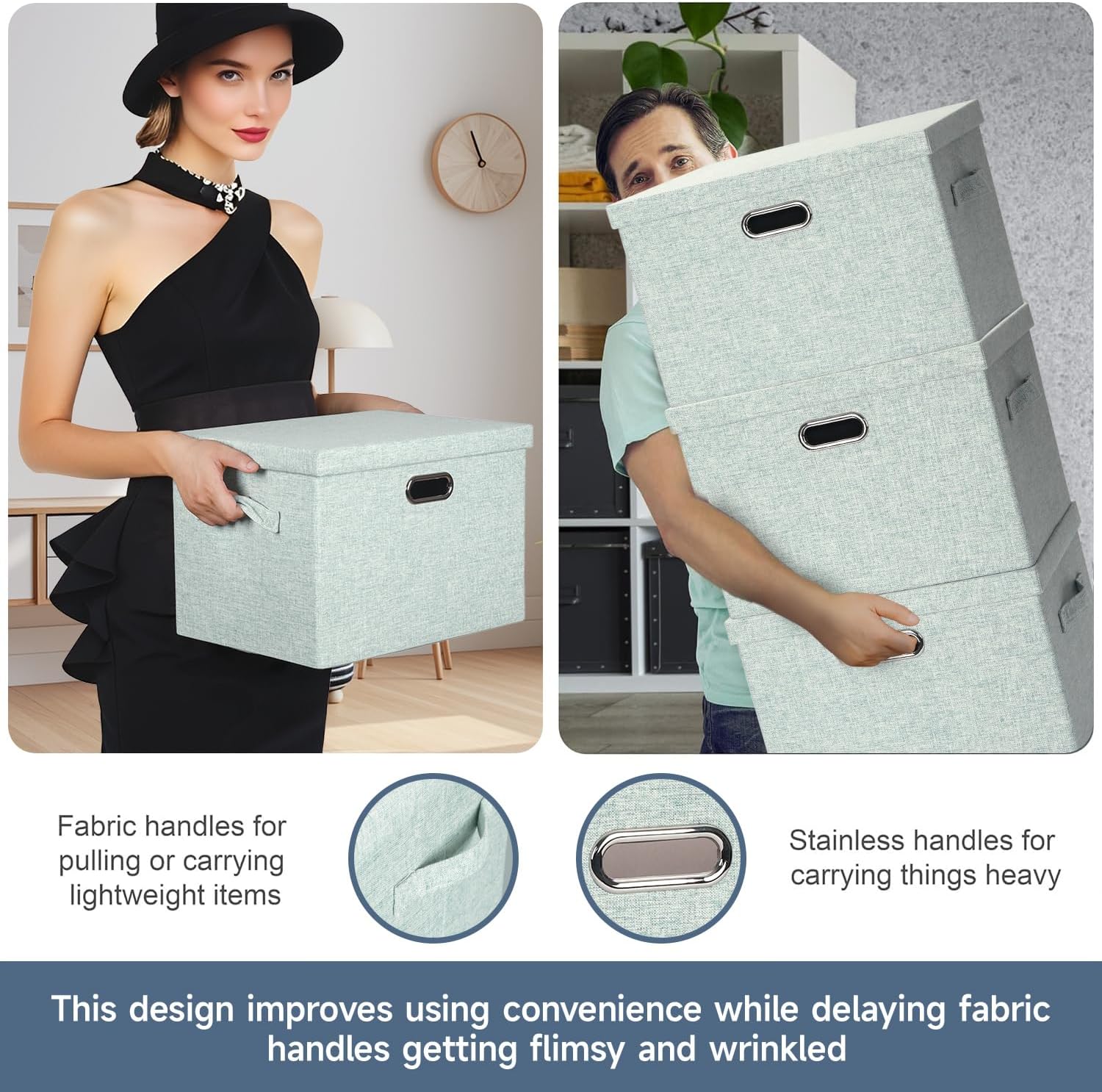Large 17" 36 Quart Collapsible Stackable Storage Bins with Lids, 3 Packs Light Green Linen Fabric Closet Boxes with Lids, Storage Cube Baskets Container Organizers for Office (17x12x11)