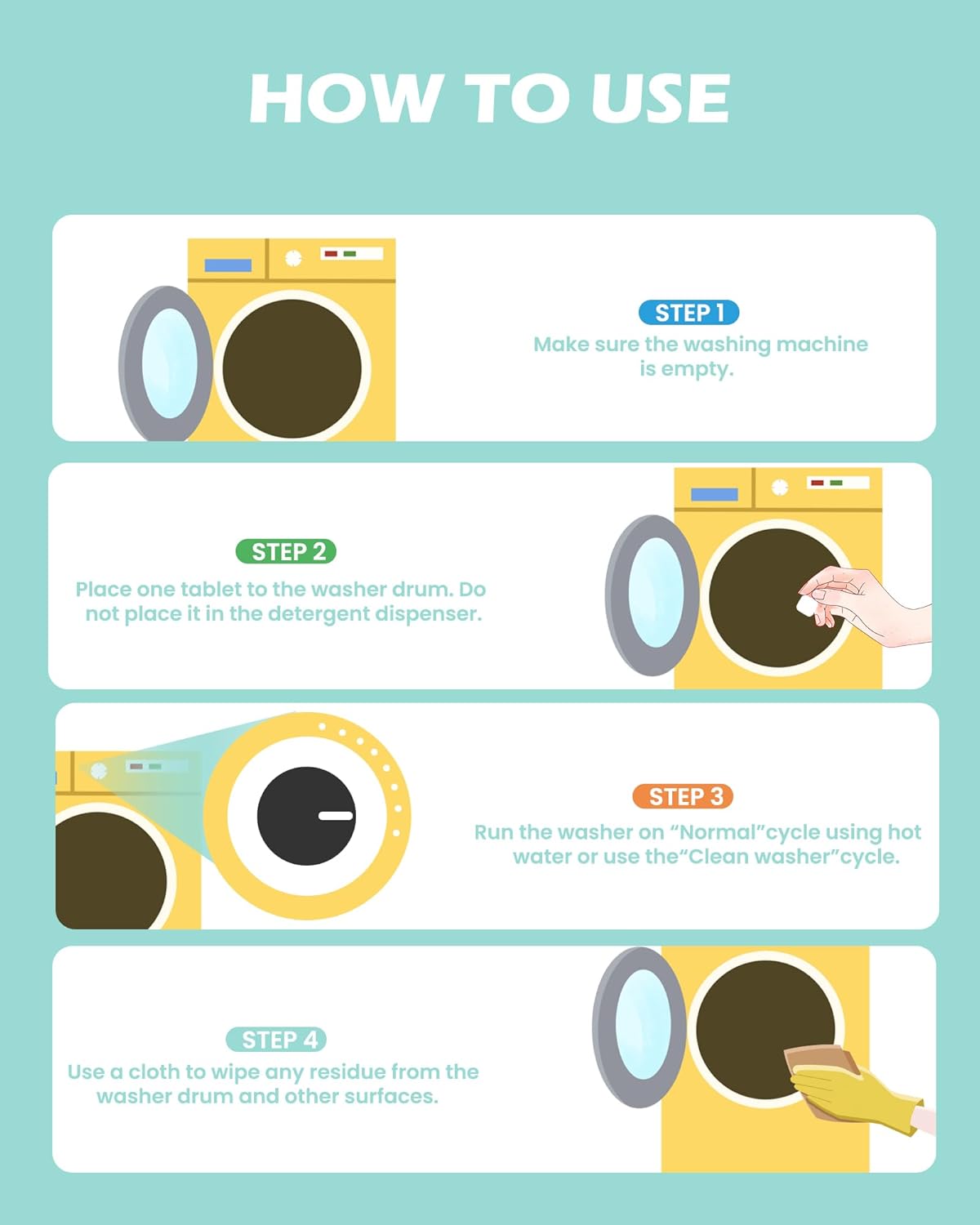 • How to Use: Place 1 tablet directly into the empty washing machine (use 2 tablets for heavy residue). Run a hot water cycle. As the tablet dissolves, its deep-penetrating foam thoroughly cleans every corner of the machine. Finally, wipe away any residue with a towel