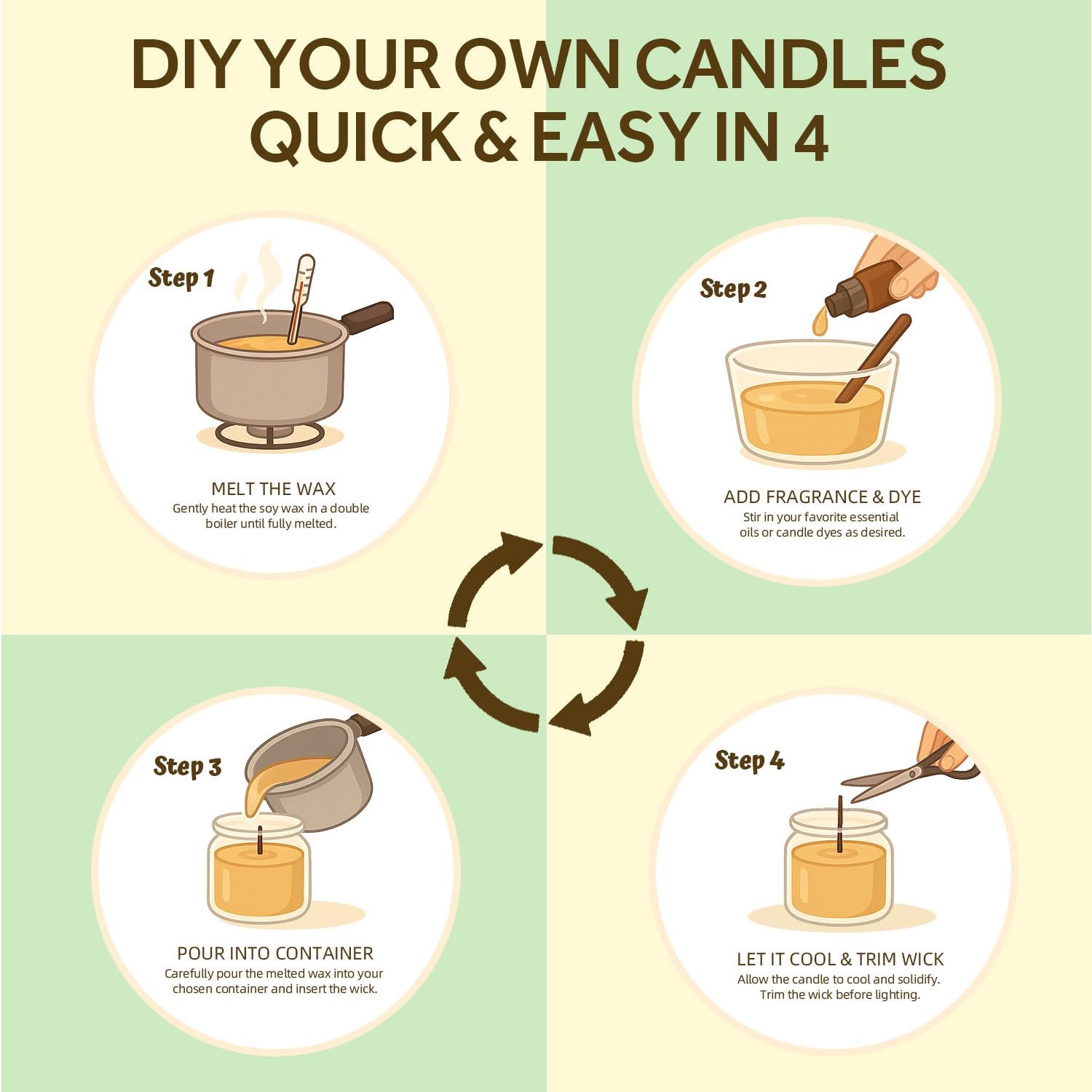• 【Pure & Natural Soy Wax】Our soy wax is sourced from organic farms and contains no additives. It burns cleanly and safely, making it the perfect base for your candle-making projects.