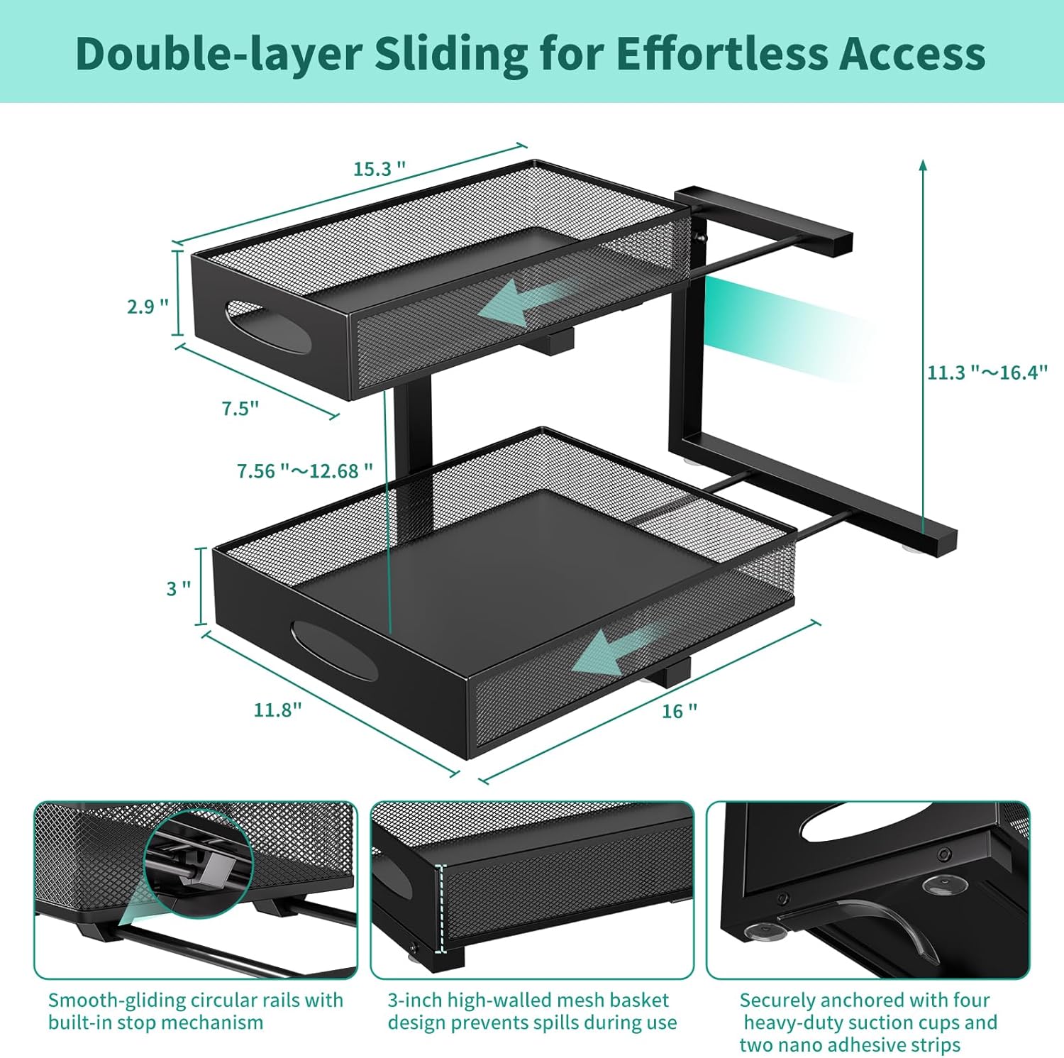 Under Sink Organizer, Extra-Wide Upgrade, 2-Pack of 2-Tier Metal Slide Out Cabinet Organizer, Height Adjustable Organization and Storage Series, Bathroom/Cabinet/Kitchen organization, Black