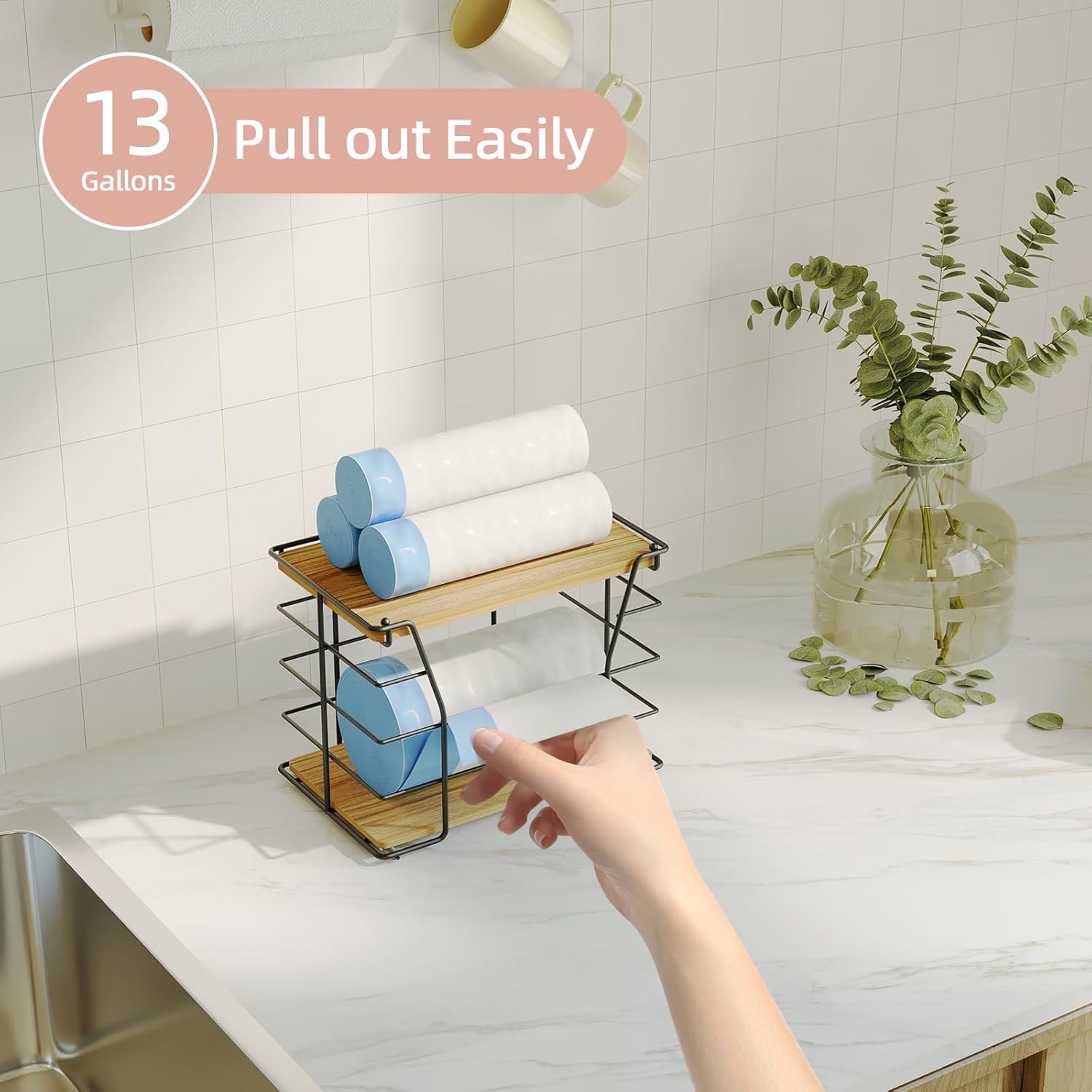 • 【Versatile for Multiple Scenarios】The garbage bag holder works seamlessly in under-sink setups (keeping trash bags within reach), pantry organizers and storage (tidying rolls), and laundry rooms. It’s also a handy kitchen organizer, simplifying home and kitchen tidying as a reliable trash bag dispenser