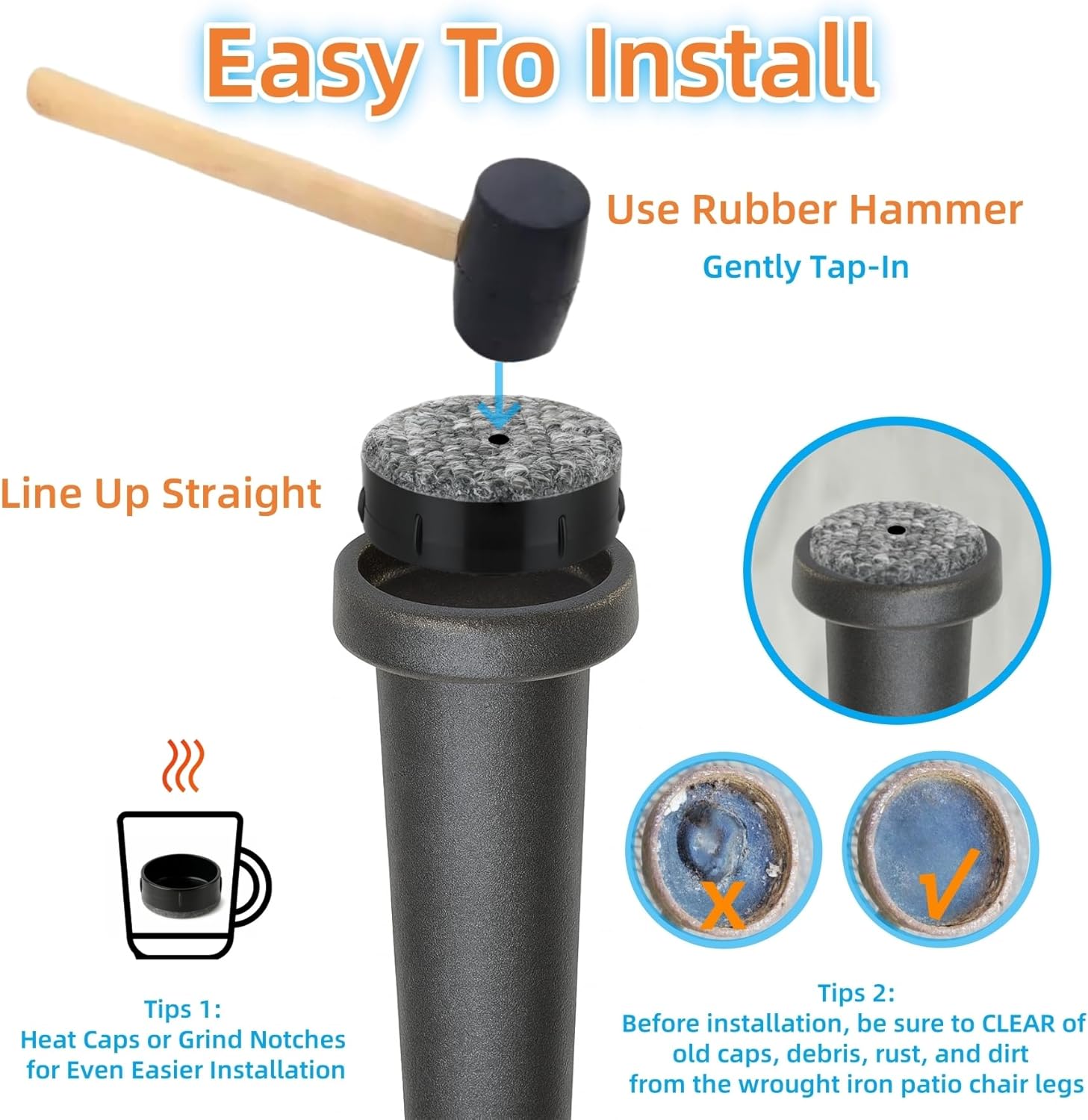 • Easy Installation, 16 Pack Value – Includes 16 patio chair feet caps for replacement glide caps of 4 chairs. Before installation, be sure to CLEAR of old caps, debris, rust, and dirt from the wrought iron patio chair legs, then tap the caps in with a rubber mallet. For even easier installation, heating the caps or grinding notches before fitting is recommended. These outdoor chair leg floor protectors provide lasting protection season after season.