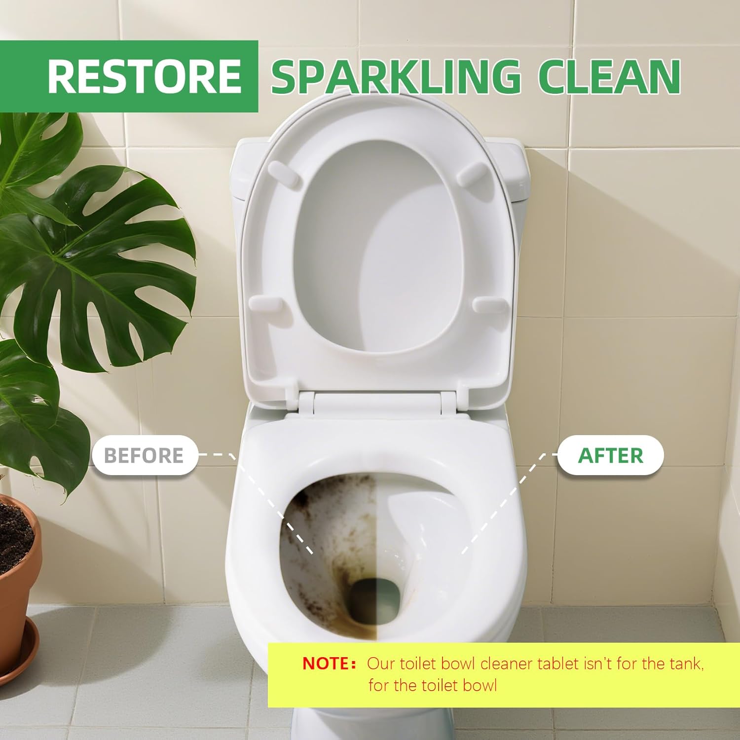 • NOTE: If the toilet is extremely dirty, you may use 2 tablets for better cleaning. This cleaning tab is for toilet bowl, not for tank. Adding about 200ml of hot water (around 60°C / 140°F) to the toilet bowl can enhance the cleaning performance