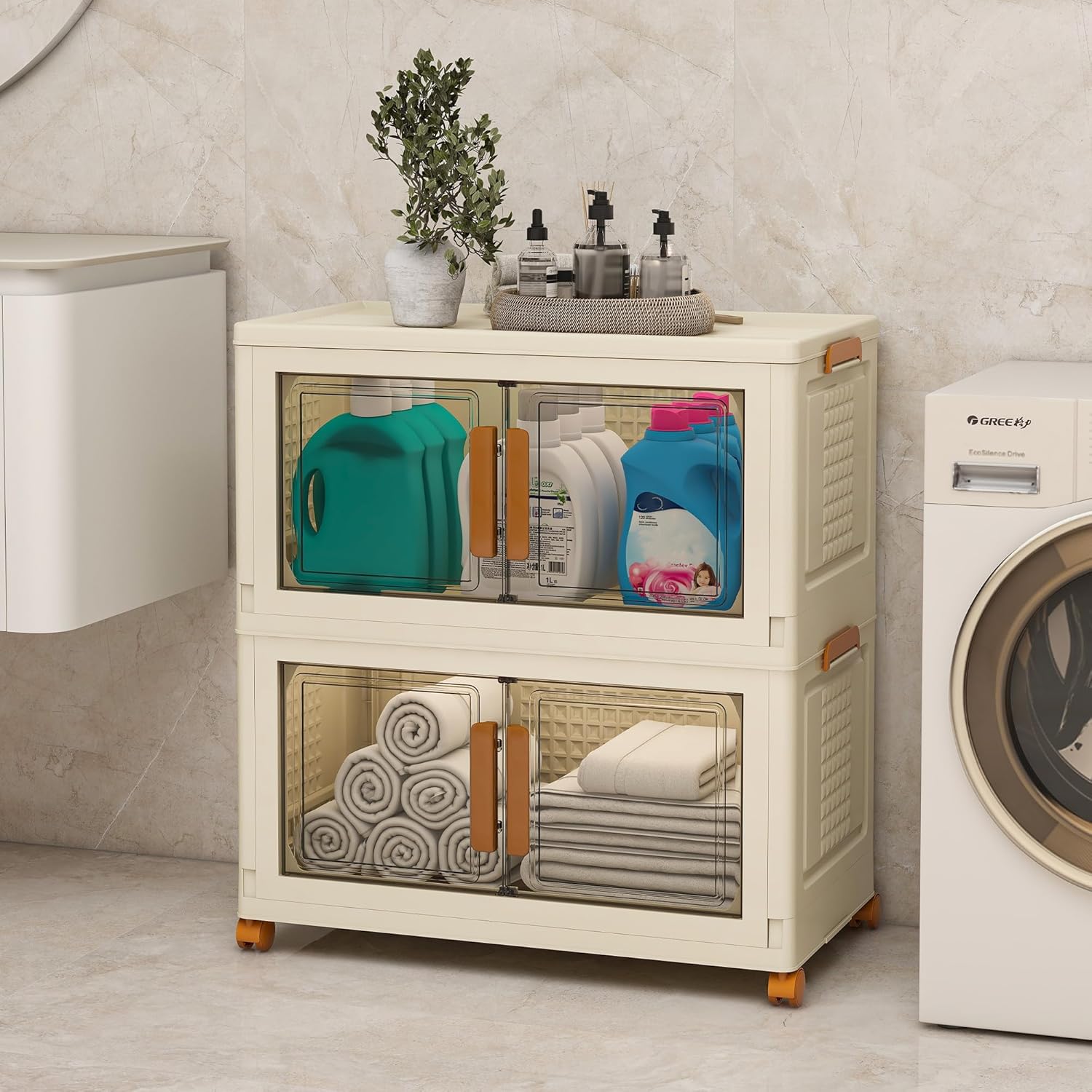 Plastic Stackable Storage Bins with Lids and Wheels, Foldable Closet Organizers and Storage Containers for Bathroom, Collapsible Clear Drawer Storage Cabinet with Doors White 22.4Gal 2Tiers