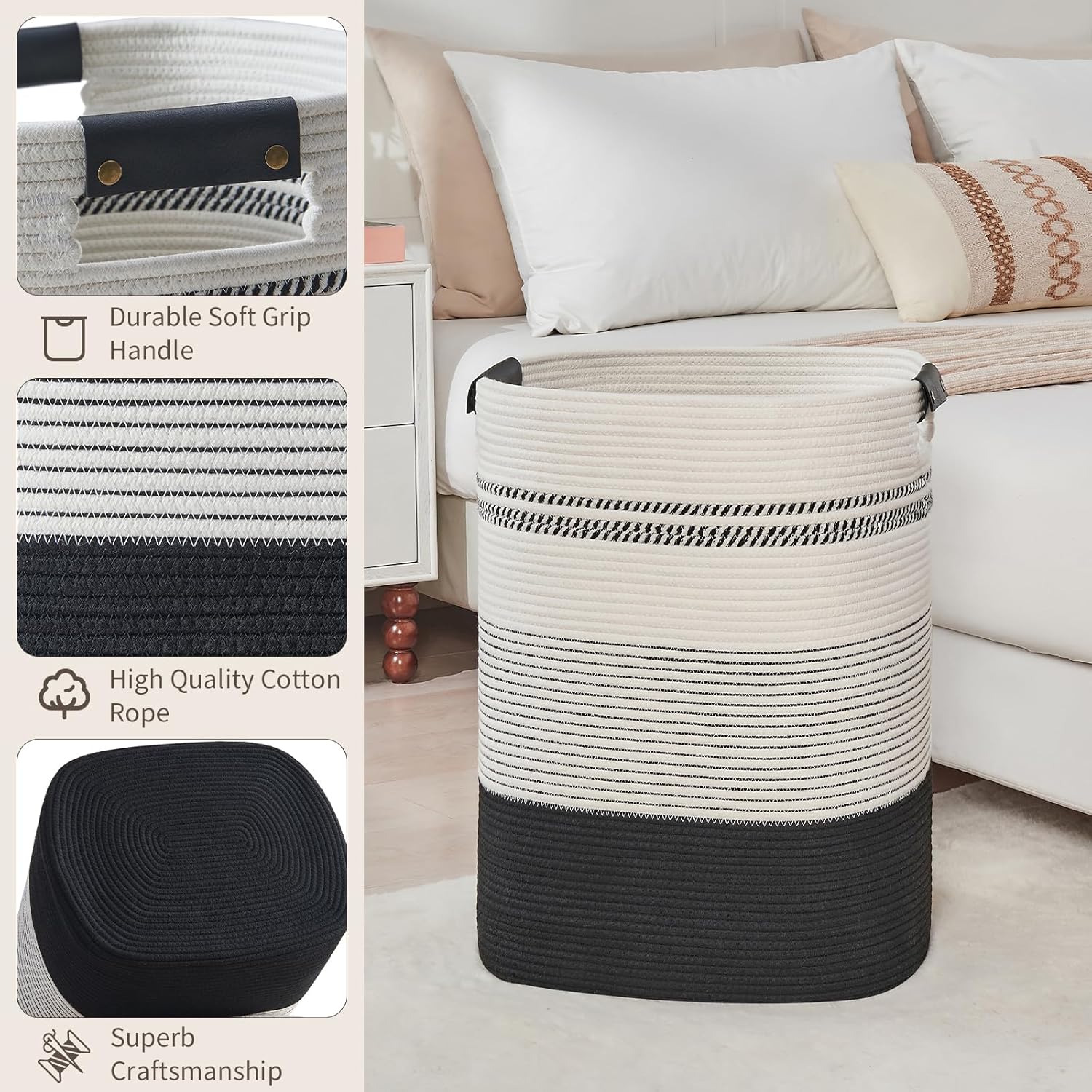 Laundry Basket with Handles - Blanket Basket & Hampers for Bedroom Aesthetic, Laundry Hamper & Blanket Storage for Living Room, Clothes Hamper, Tall, Large 17" x 14" x 22”, Black & White