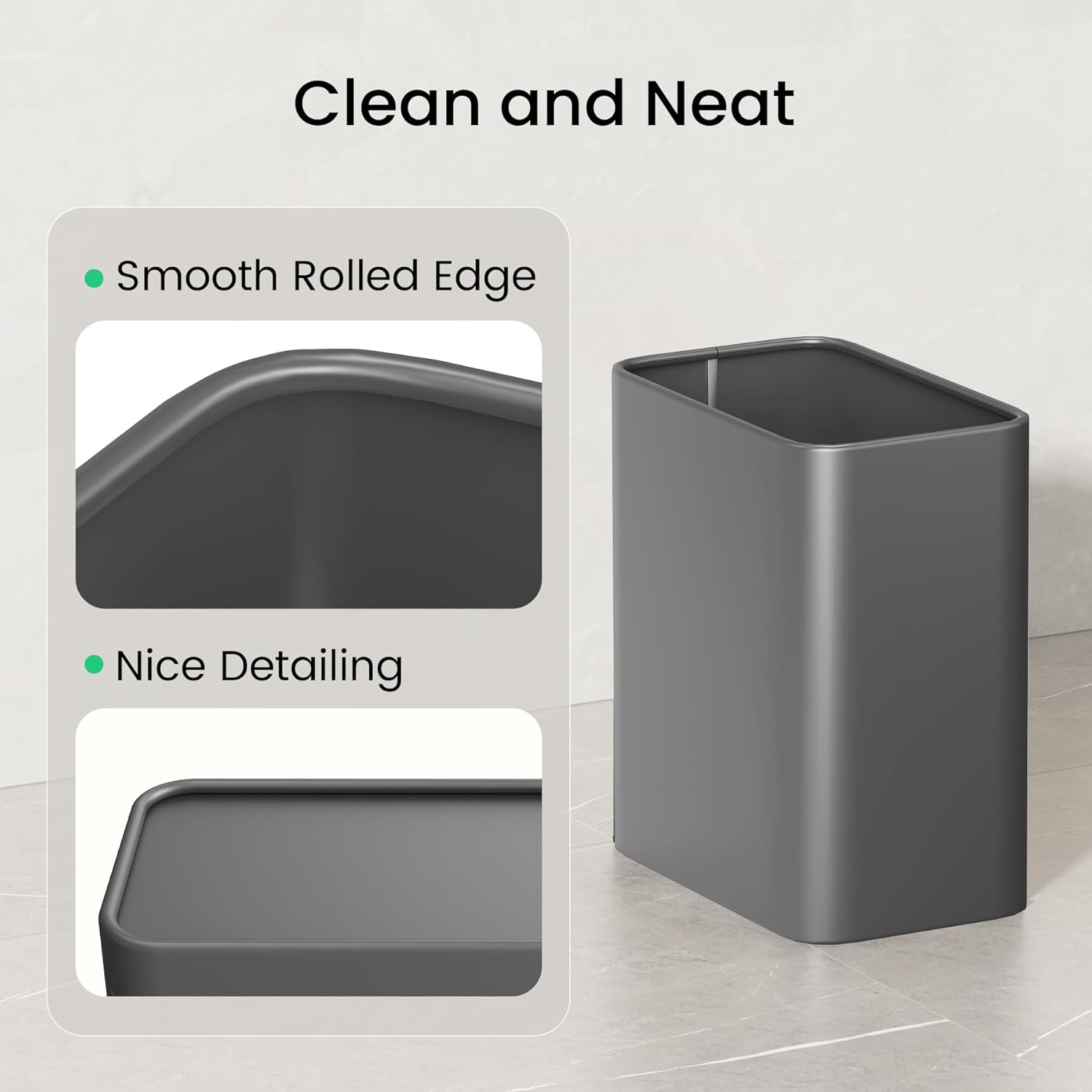 • Compact Size for Tight Spaces: With dimensions of 8.86''L x 5.51''W x 10.16''H, this 2.1-gallon (8-liter) gray trash can is purposefully small, perfect for limited spaces where larger bins may not fit. Ideal for light use, it’s a discreet waste solution for bathrooms, under sinks, under desks, nside cabinets, and narrow areas, ensuring you make the most of every inch