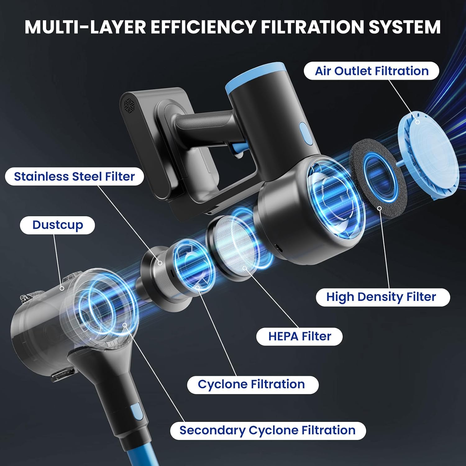 • 【Multi-Layer Filtration for Cleaner Air & Hassle-Free Disposal】This cordless vacuum cleaner features a multi-layer sealed cyclone filtration system that efficiently captures fine dust using a high-performance HEPA filter, locking debris securely in the dust cup. The bottom-release dustbin allows one-touch, hands-free emptying—making cleaning more convenient, hygienic, and mess-free.