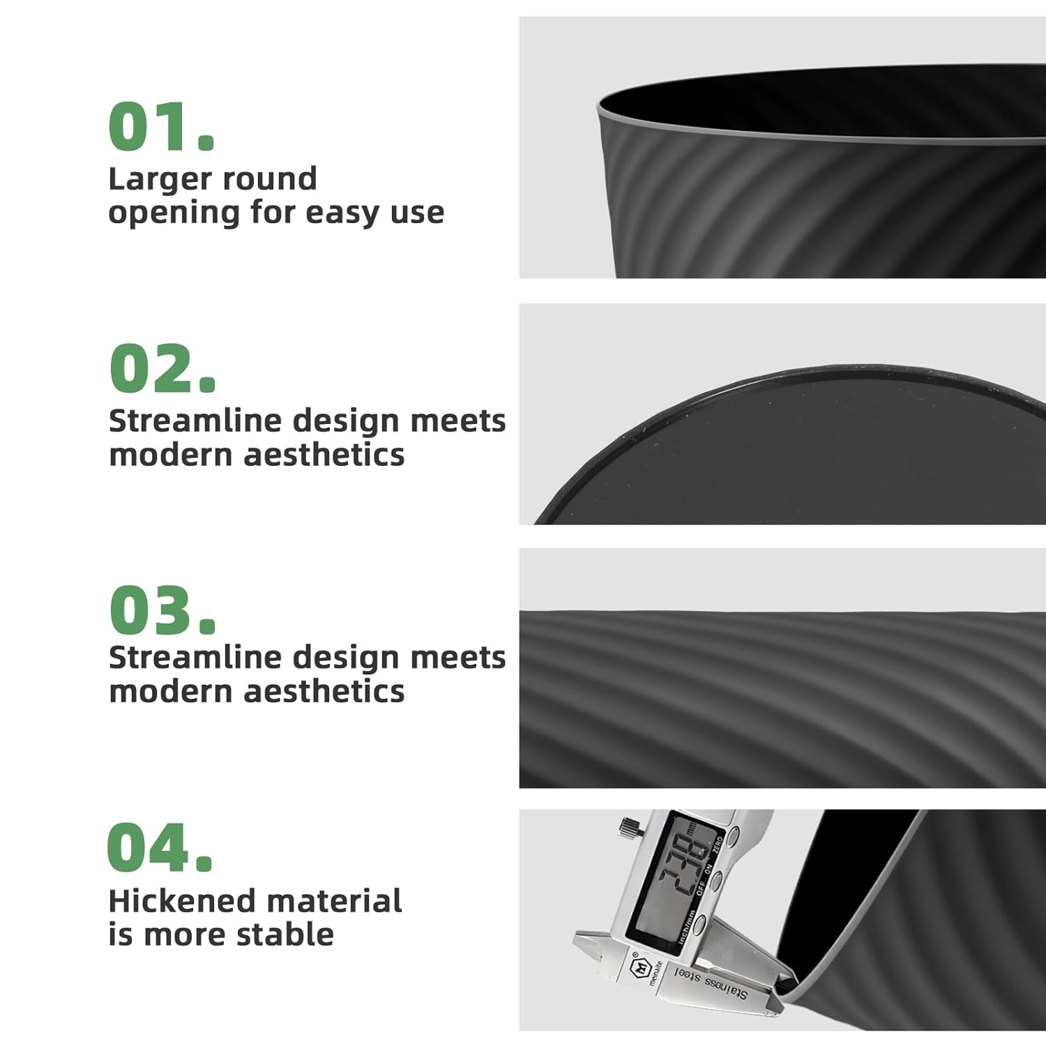• 💪【Sturdy & Multipurpose】 Built to last with impact-resistant plastic and a raised anti-slip base to reduce wear. Beyond trash, use them as storage bins for toys, laundry, or cleaning supplies—or even as a mini flower pot! Effortlessly wipes clean for hygiene.