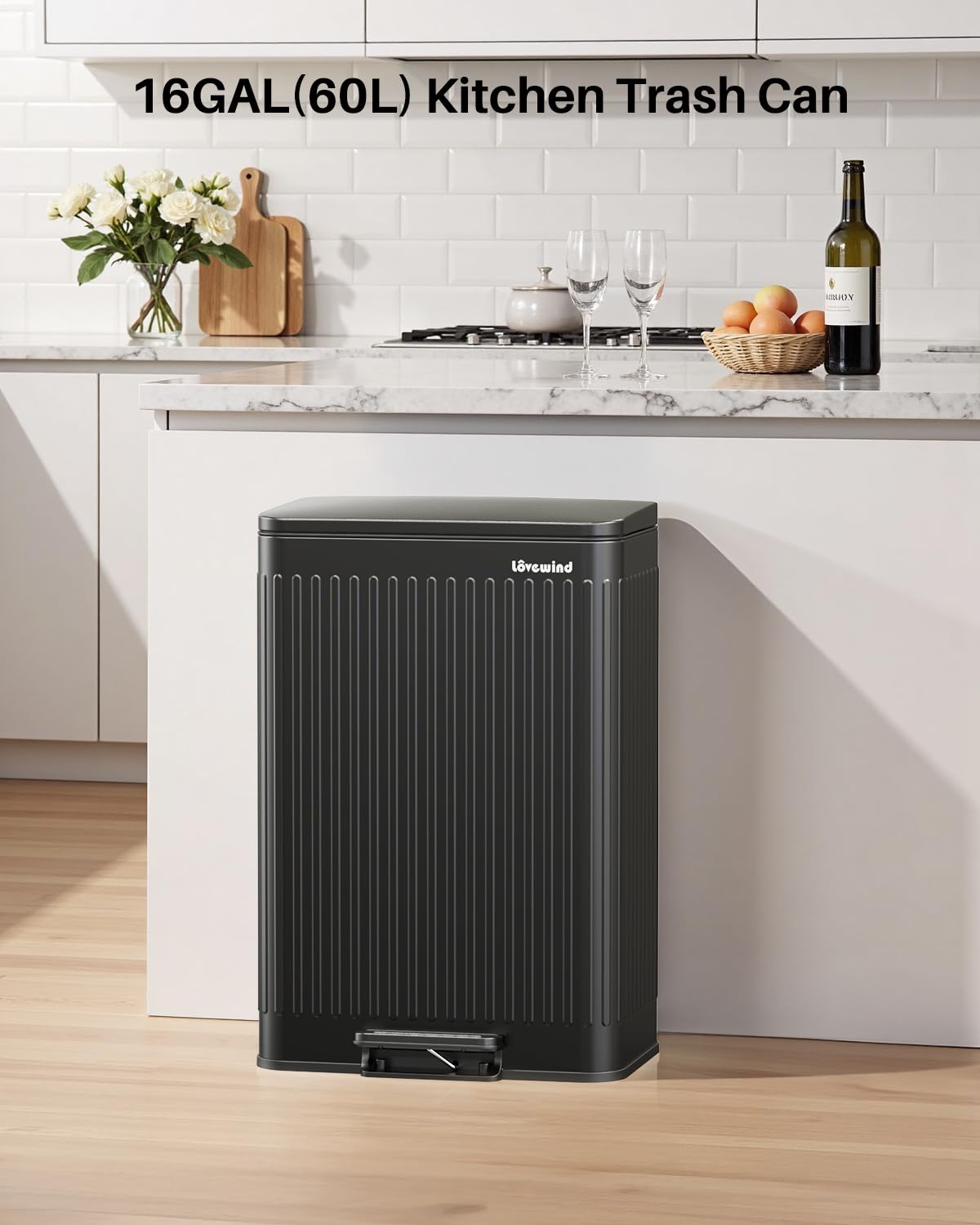 Lovewind 60 Liter/ 16 Gallon Stainless Steel Trash Can with Soft-Close Lid, Large Footstep Garbage Can with Roman Texture, Removable Inner Buckets, Recycling Bin for Kitchen Office, Black