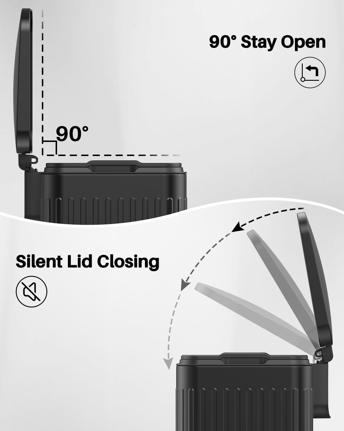 • Whisper-quiet Closing & 90° Stay Open Lid: The recycle bins for kitchen feature a soft-close mechanism that allows the lid to close gently, slowly, and silently. Just flip up the lid slightly, the trash can with lid will lock into a 90° open position as you want