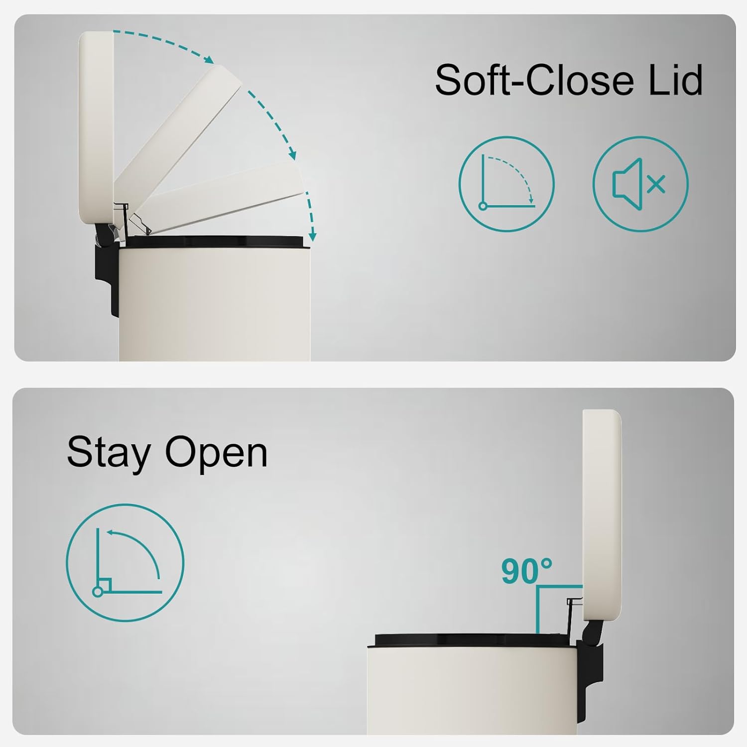 • 【Noiseless Soft-Close Mechanism】Say goodbye to disruptive bangs! The gentle, silent-closing lid operates smoothly, staying open at a 90-degree angle for touch-free use while effectively sealing in odors—ideal for kitchens or office spaces.