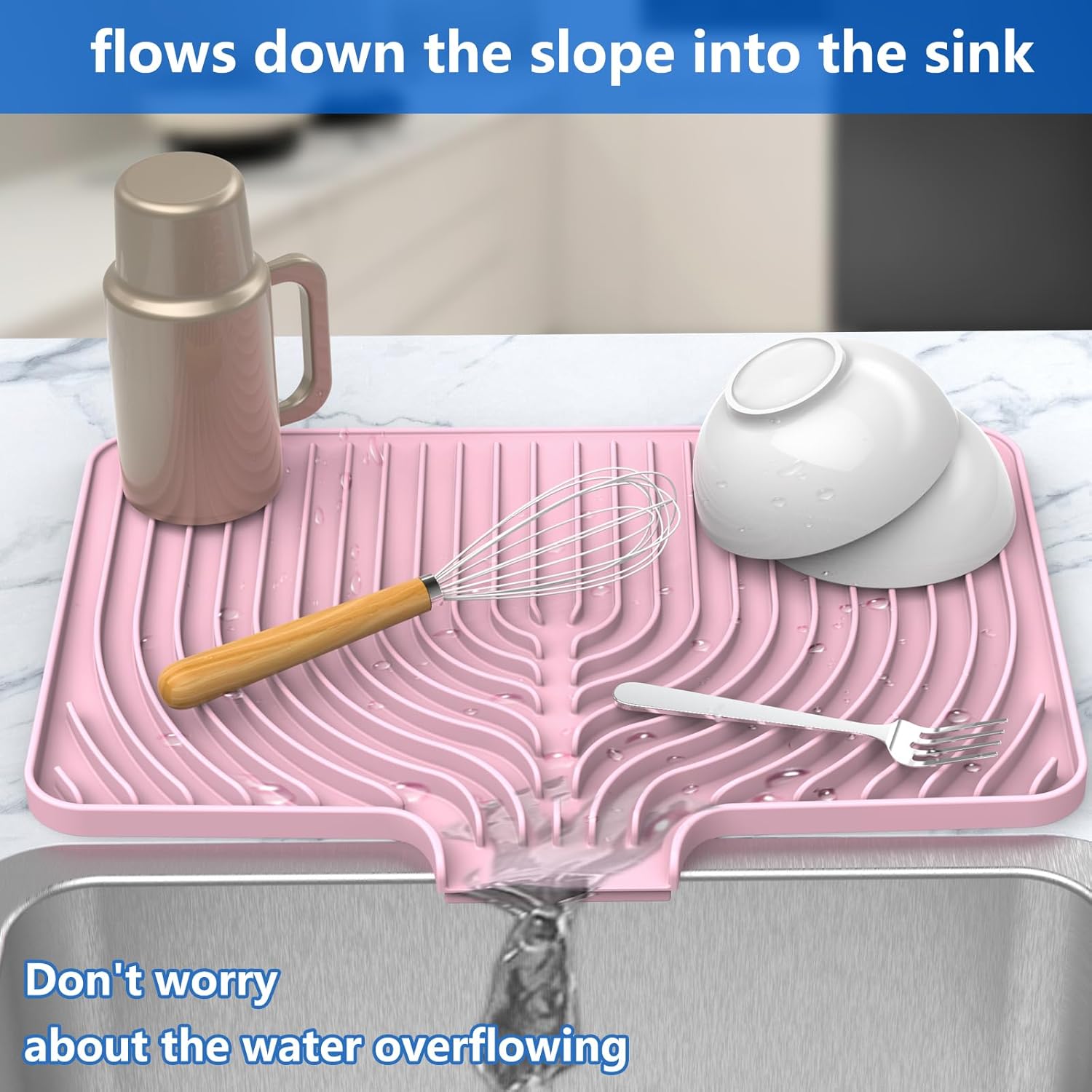 Dish Drying Matt for Kitchen Counter,18"×12"Silicone Dry Rack Mat with Built in Drain, Kitchen Dry Mats for Dishes Drying Pad for Counter(18"×12"Pink)