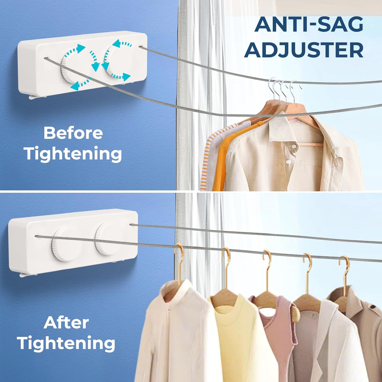 • 【Retractable Clothesline Indoor Outdoor Heavy-Duty】 Upgrade 304 Stainless Steel Clothes Line anti-sag design supports Single rope 40lb double rope use 70lb . Features a knob-locking mechanism for stable drying of heavy items like Outdoor Drying Rack Clothing blankets and jeans.