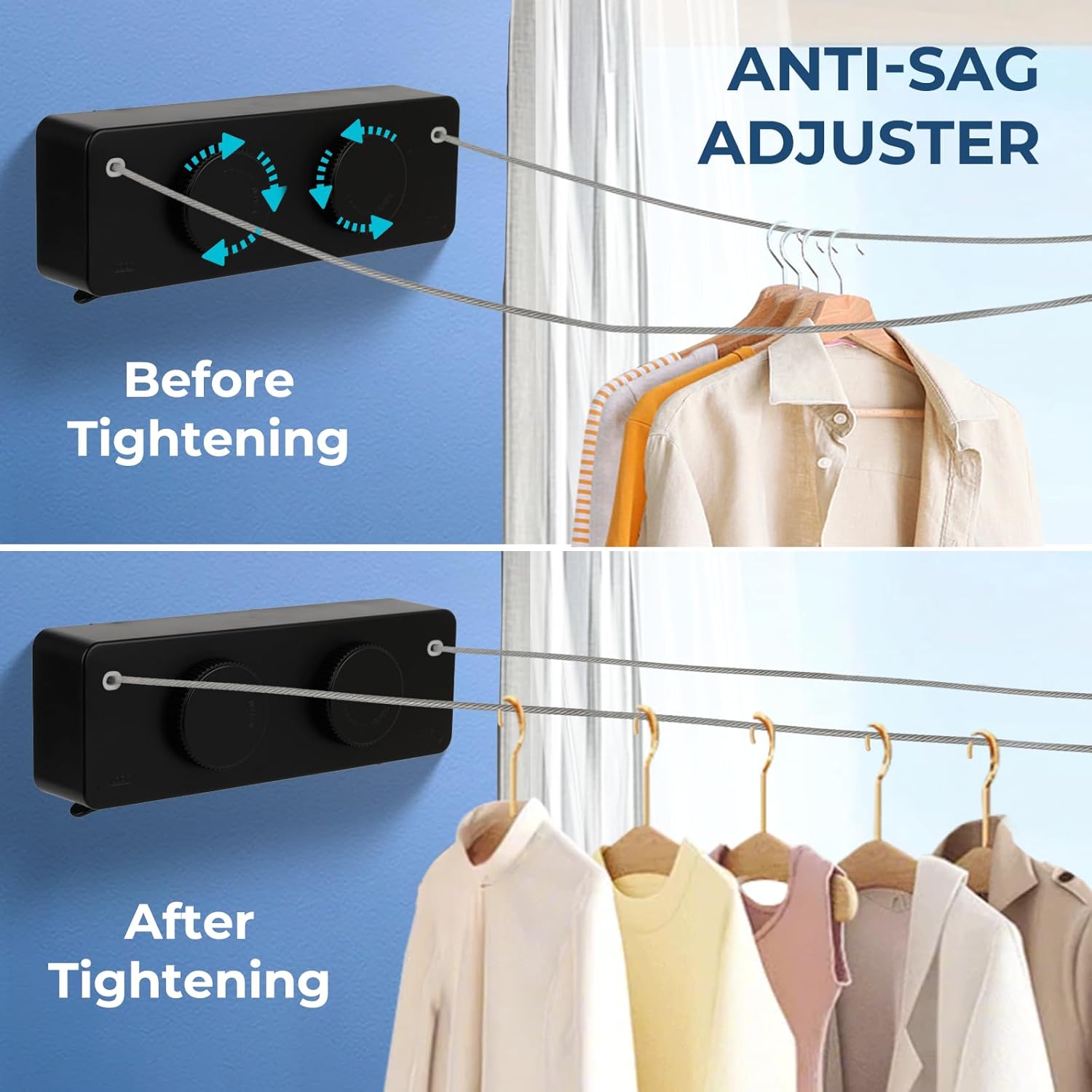 • 【Premium 304 Stainless Steel Construction】 304 double stainless steel shower room clothes line indoor adjustable tension knob maintains optimal tightness. Corrosion-proof for long-lasting performance.