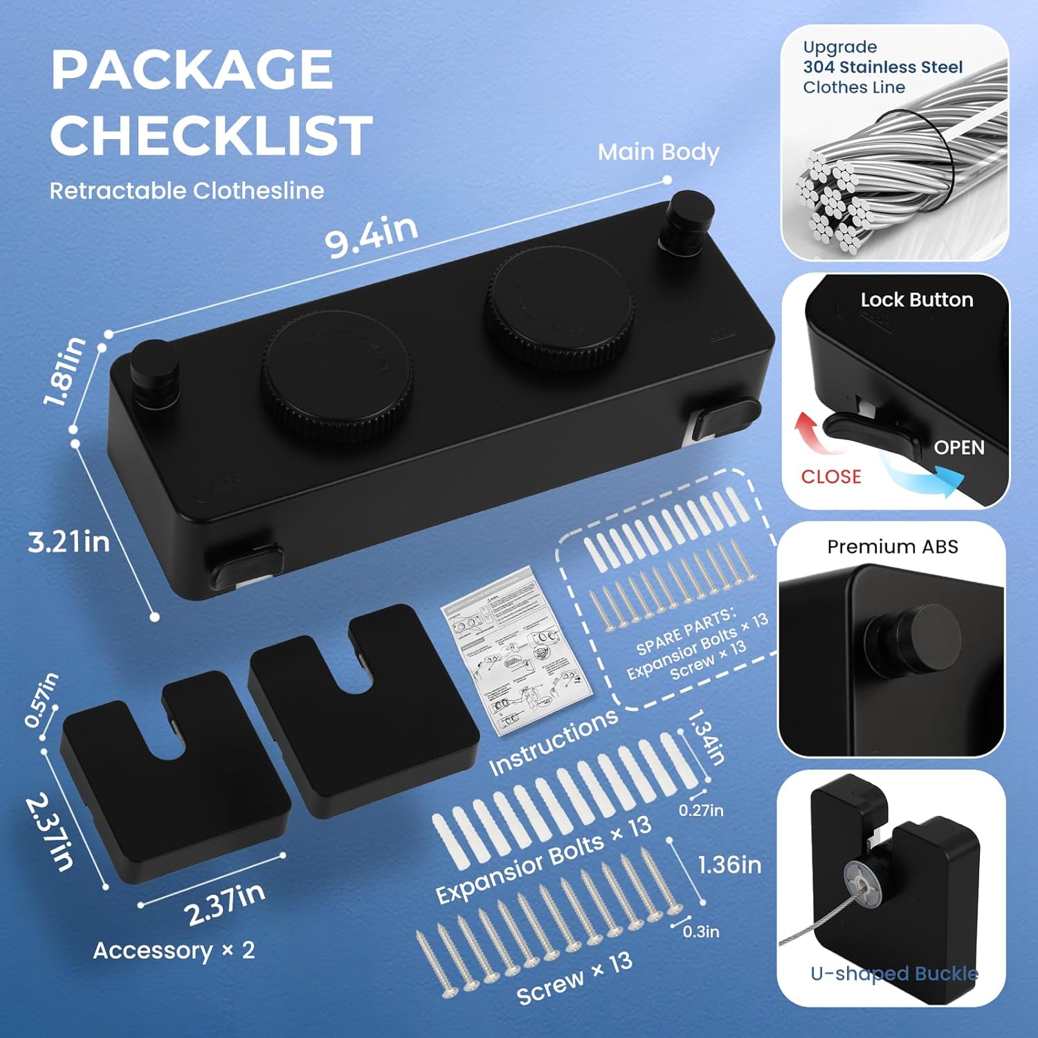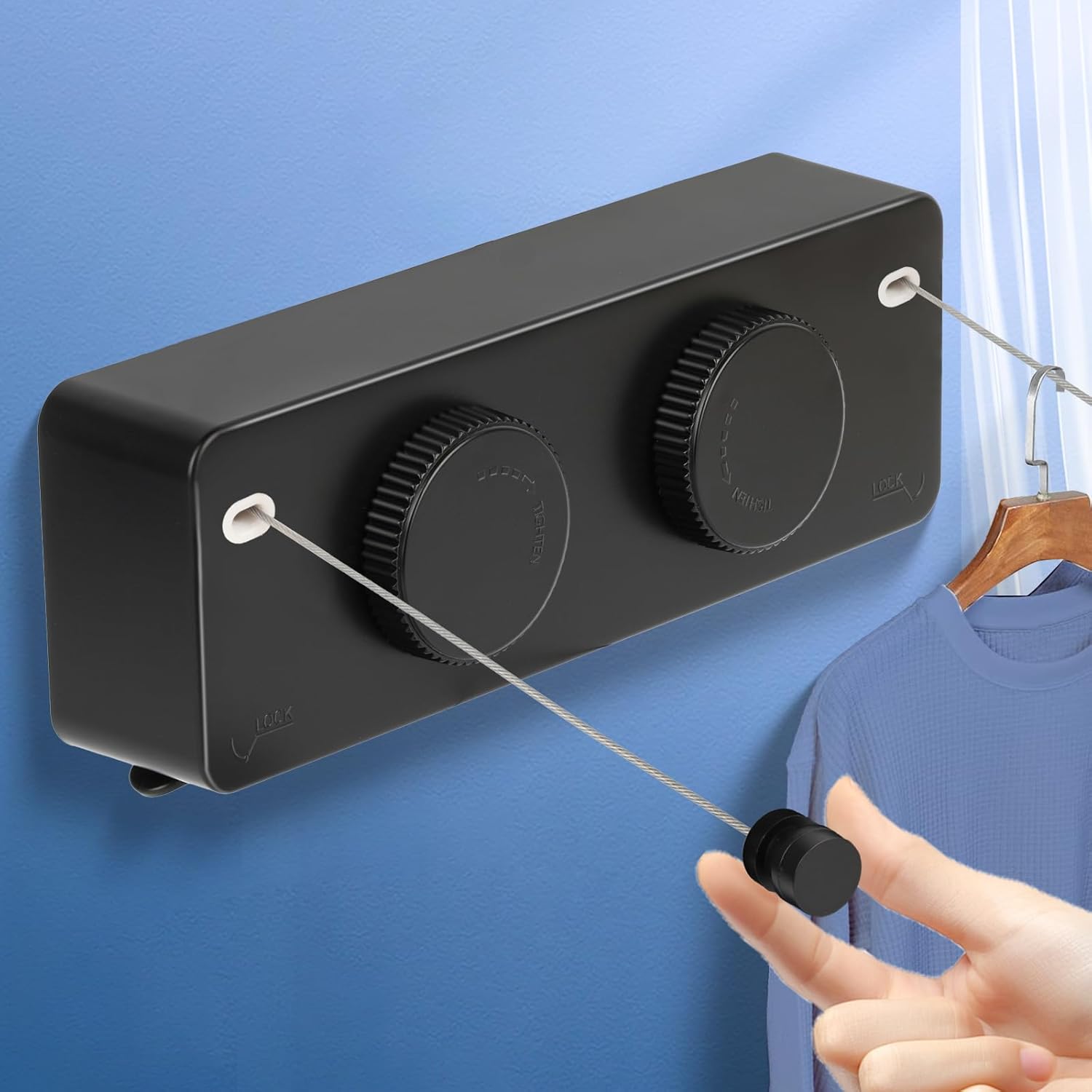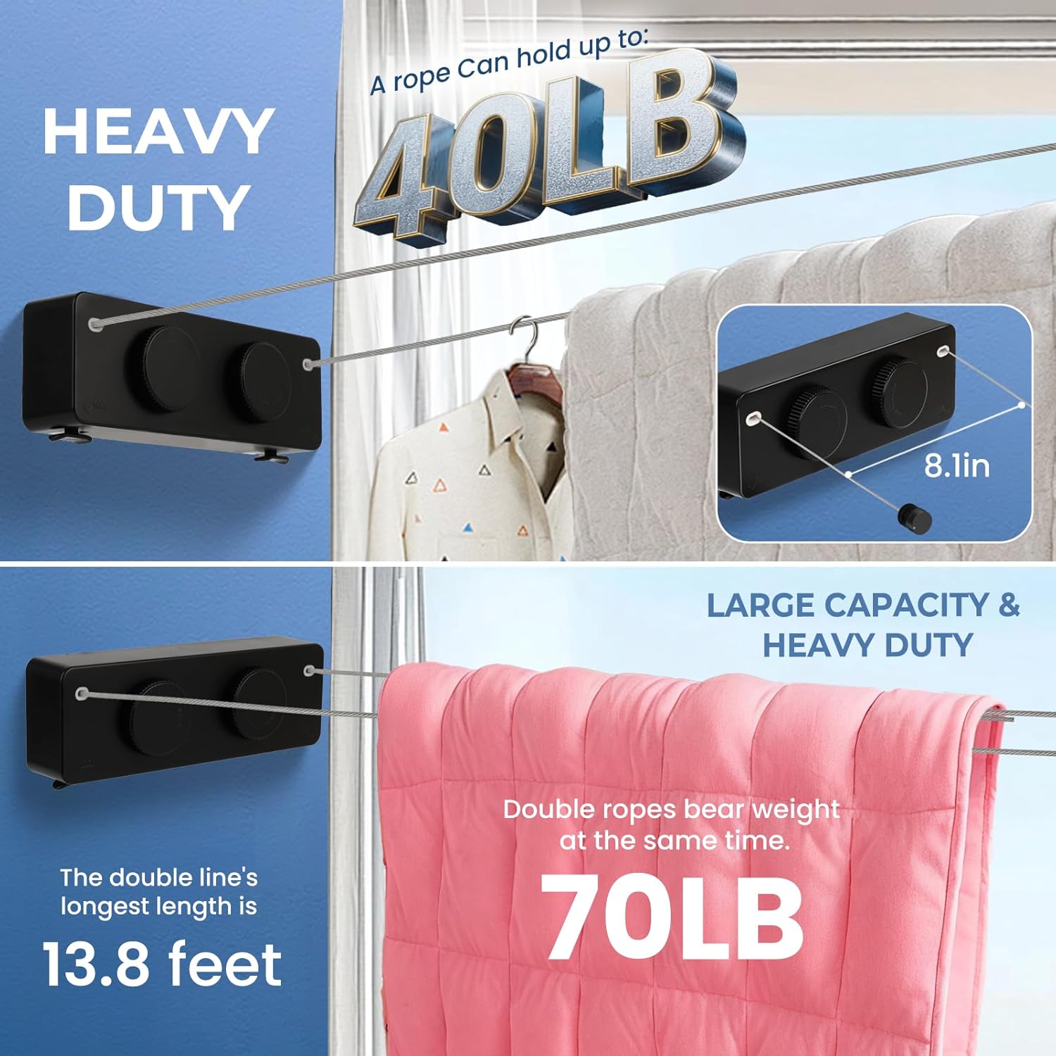 • 【Retractable Clothesline Indoor Outdoor Heavy-Duty】 Upgrade 304 Stainless Steel Clothes Line anti-sag design supports Single rope 40lb double rope use 70lb . Features a knob-locking mechanism for stable drying of heavy items like Outdoor Drying Rack Clothing blankets and jeans.
