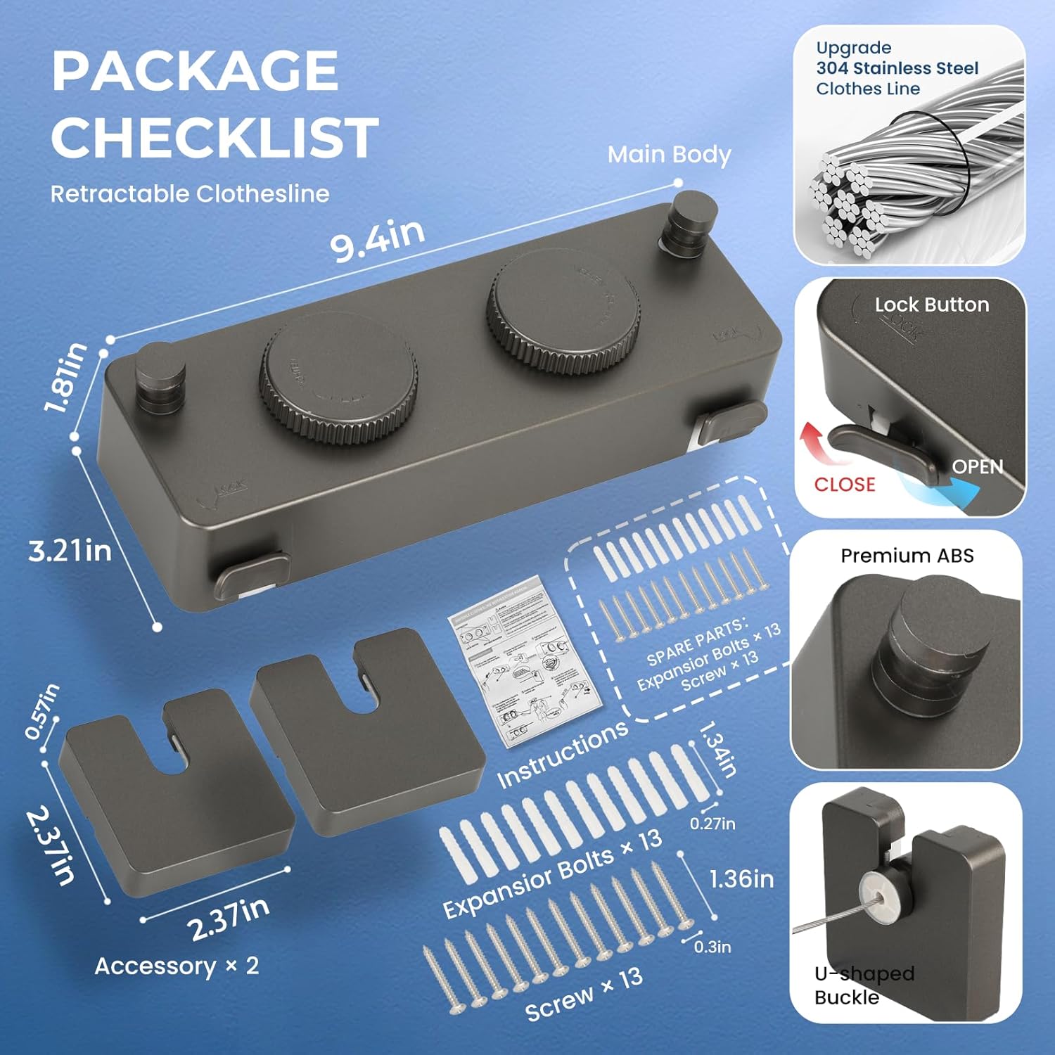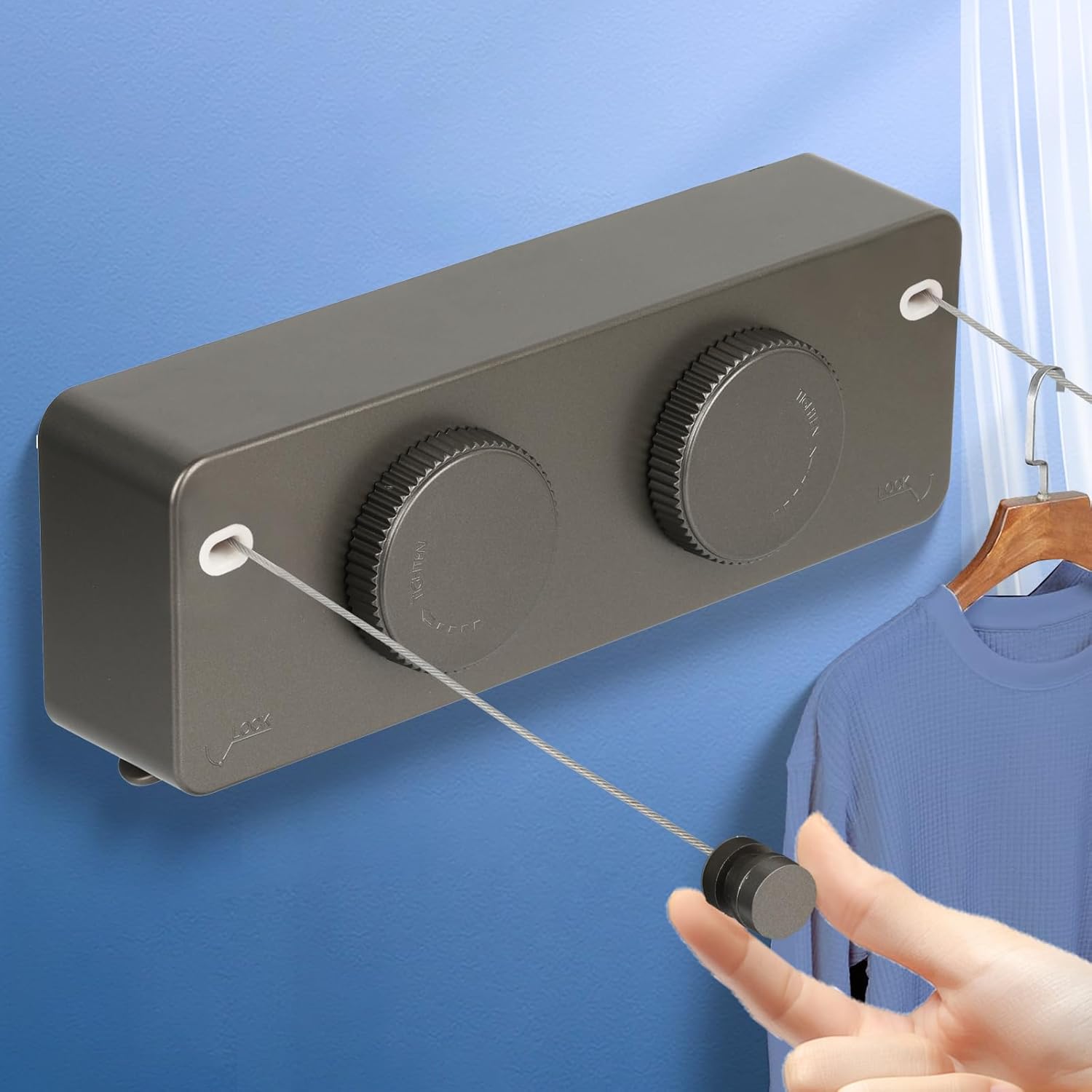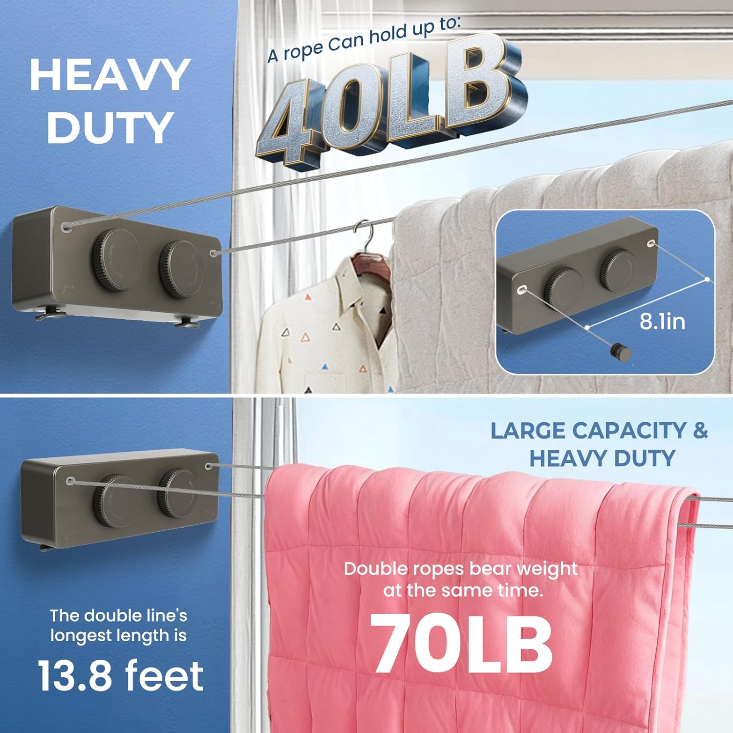 • 【Retractable Clothesline Indoor Outdoor Heavy-Duty】 Upgrade 304 Stainless Steel Clothes Line anti-sag design supports Single rope 40lb double rope use 70lb . Features a knob-locking mechanism for stable drying of heavy items like Outdoor Drying Rack Clothing blankets and jeans.