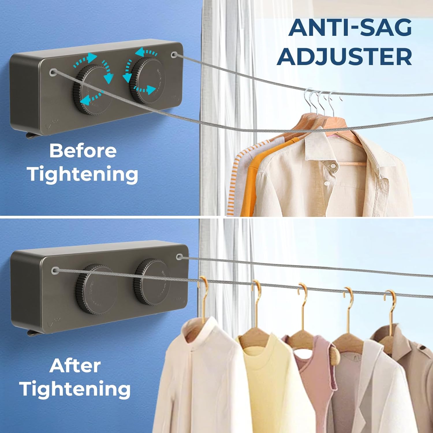 • 【Premium 304 Stainless Steel Construction】 304 Double stainless steel shower room clothes line indoor adjustable tension knob maintains optimal tightness. Corrosion-proof for long-lasting performance.