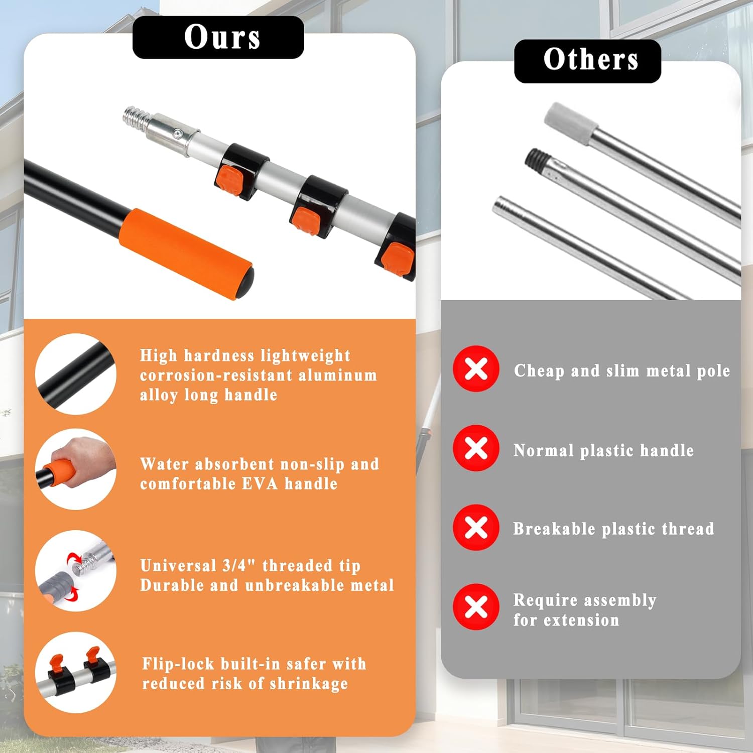 • 2-in-1 Window Squeegee with Extension Pole – Wet chenille cloth cleans dirt and dust, then the squeegee removes water streaks for sparkling, streak-free glass. The head rotates 180° with 7 adjustable positions, fitting all window types for easy, efficient cleaning