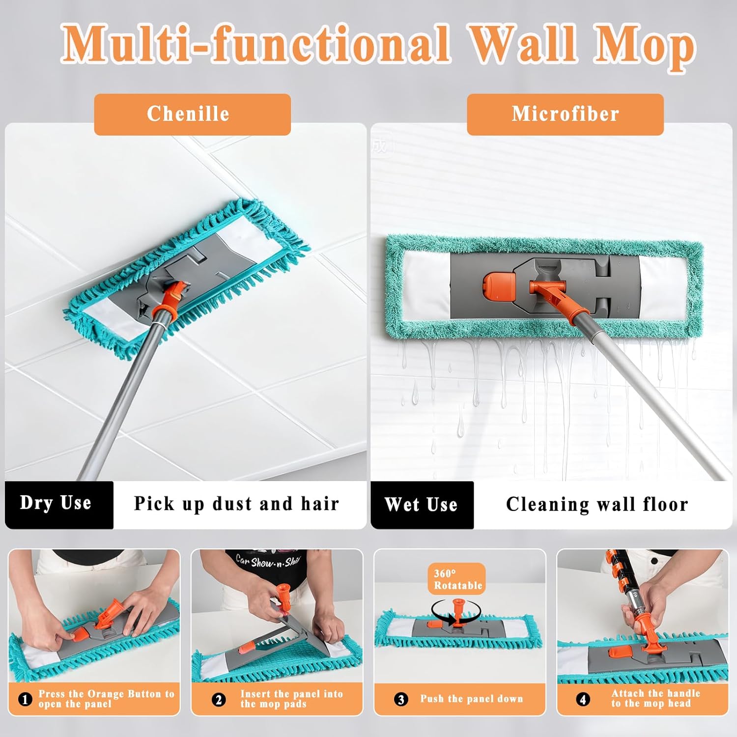 • 360° Rotating Head & Wet/Dry Wall Cleaner Mop – Features a flexible 360° rotating head that easily reaches corners, high walls, and ceilings for efficient cleaning. Includes 2 microfiber pads for deep wet cleaning, ideal for bathroom walls and windows, and 2 chenille pads for dry dusting to remove dust, dirt, and hair