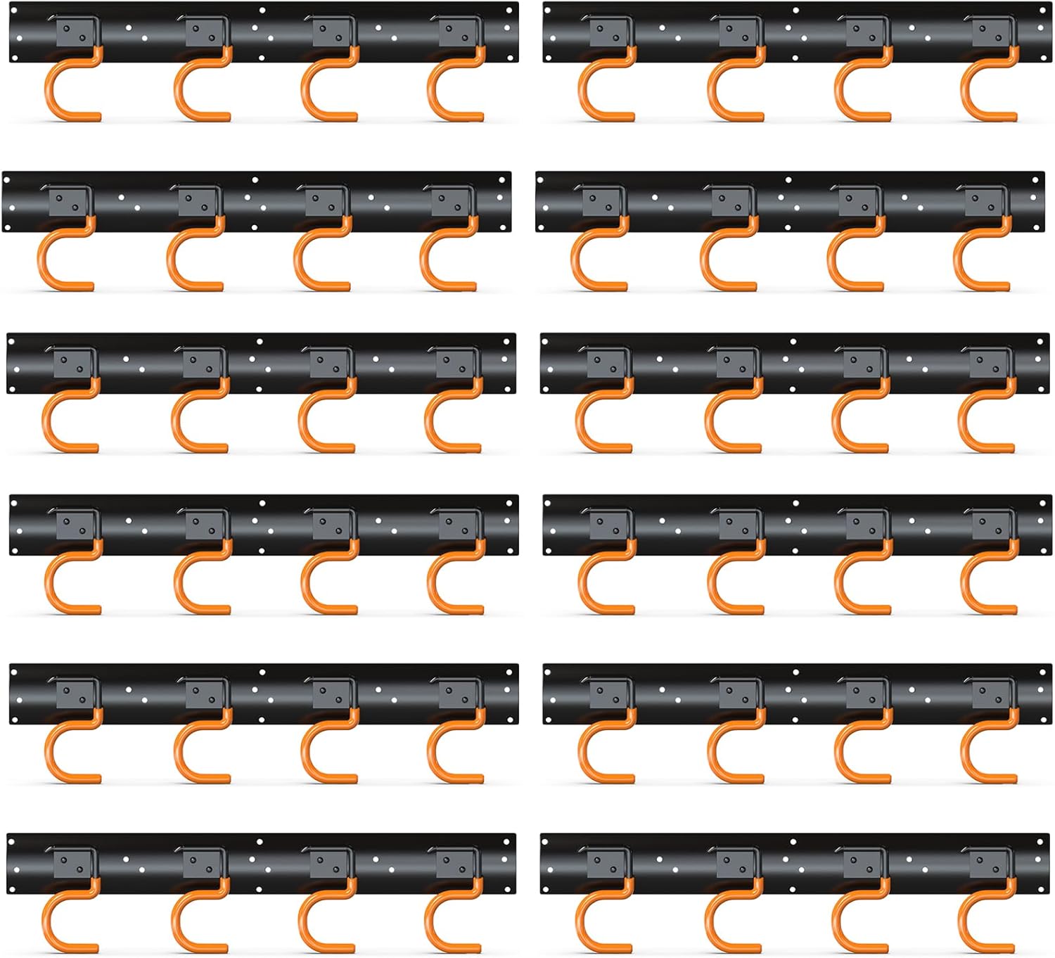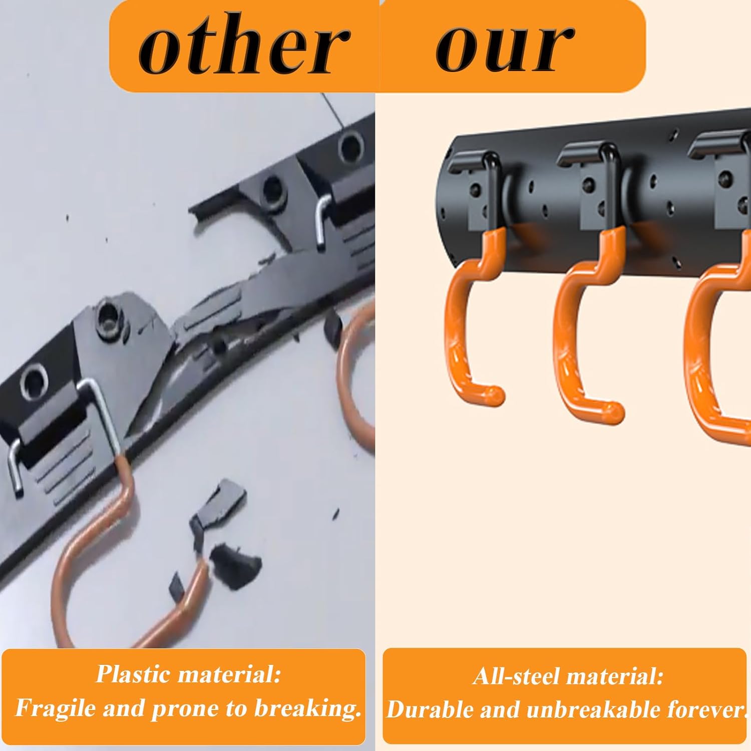 • Fully metal made: Our garage organizer wall mount back panel and hooks are all made of solid steel which makes the broom hanger wall mount is durable and sturdy. With more than 20 years' experience in mount, we have passed the professional load-bearing test, the maximum load of this broom organizer wall mount total is 120 lbs (each panel 60 lbs,each hook 15 lbs). The load-bearing capacity of the shed organizer far exceeds plastic made garage hooks and its service life is longer