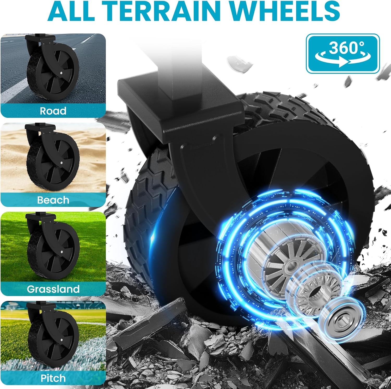 • 【Manoeuvrability Foldable Wagon】Equipped with two 360° swiveling front wheels,this wagon glides smoothly not just on regular roads, but also tackles tricky surfaces such as meadows and gardens with ease.The telescopic handle adjusts to different heights, ensuring a comfortable grip for users of all statures.