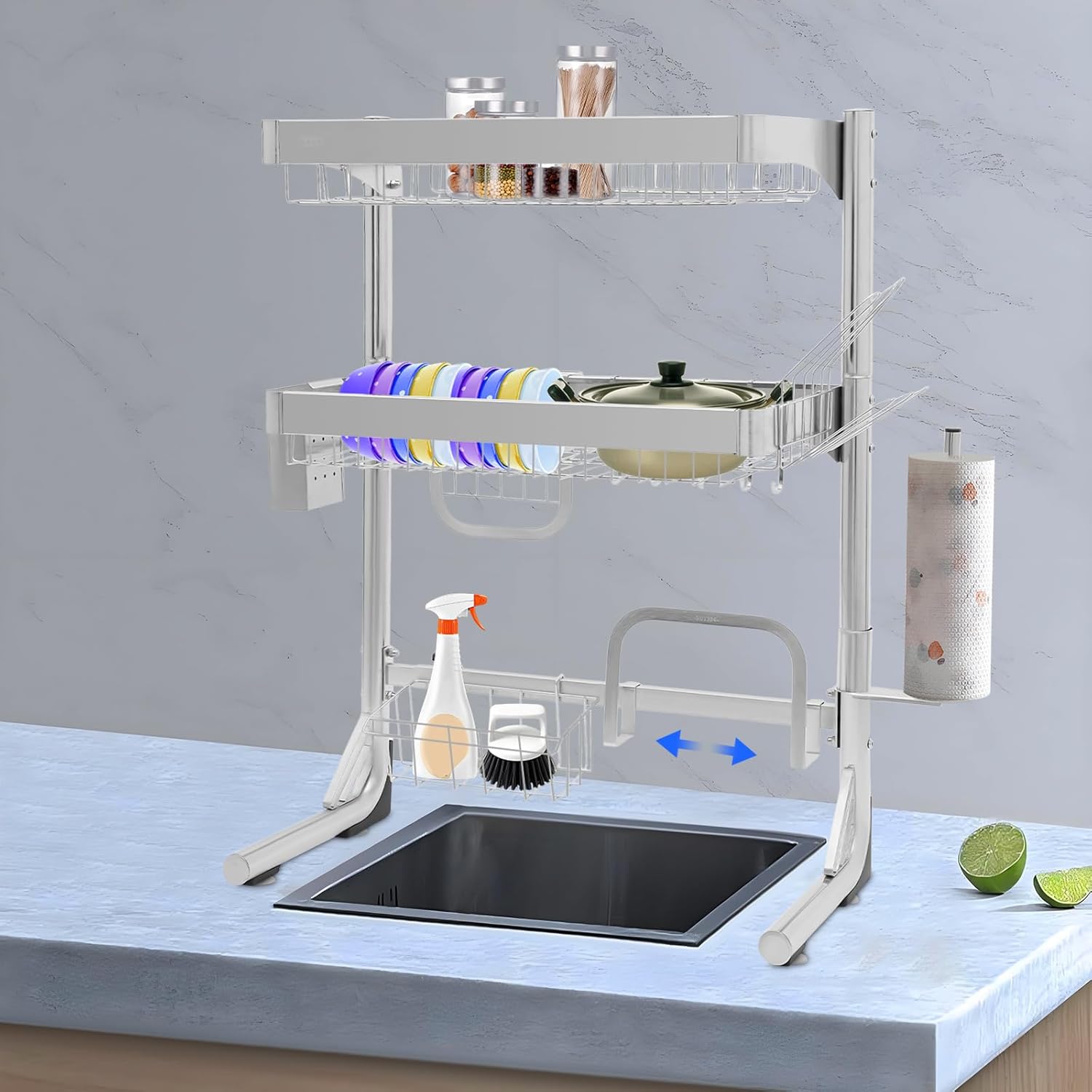 • 【Well-Considered Features】: With an adjustable width range of 20.94-33.07 inches, this product fits a variety of sink sizes. Its open-shelf design enhances accessibility and visibility, and the movable side accessories allow for convenient, personalized arrangements.