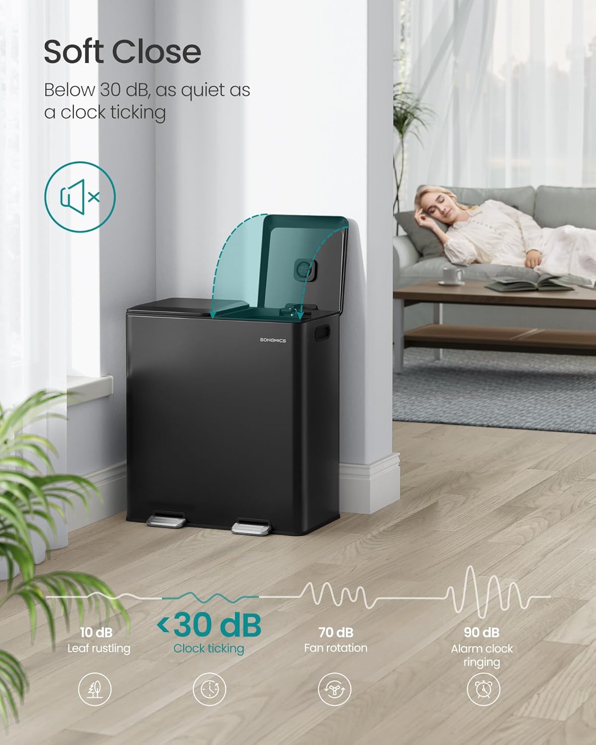 • Hands-Free, Silent, Fresh: The pedals allow for hands-free opening, while the soft-close lids ensure quiet use without loud clangs. The scent pods in the lids neutralize unpleasant odors