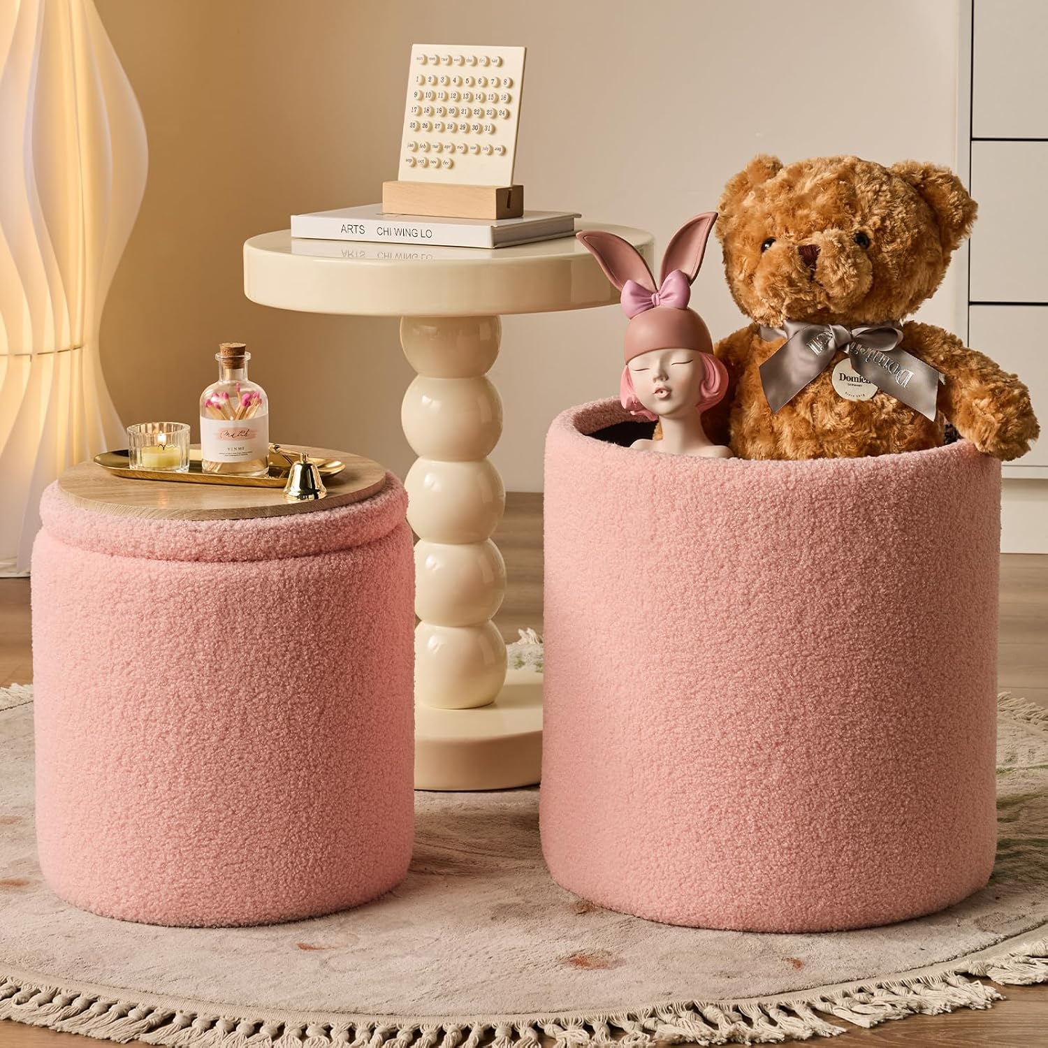 Round Ottoman with Storage Set of 2-Upholstered Sherpa Vanity Stool for Makeup Multifunctional Ottomans Coffee Table Padded Seat Foot Rest for Living Room&Bedroom(Sherpa Pink)