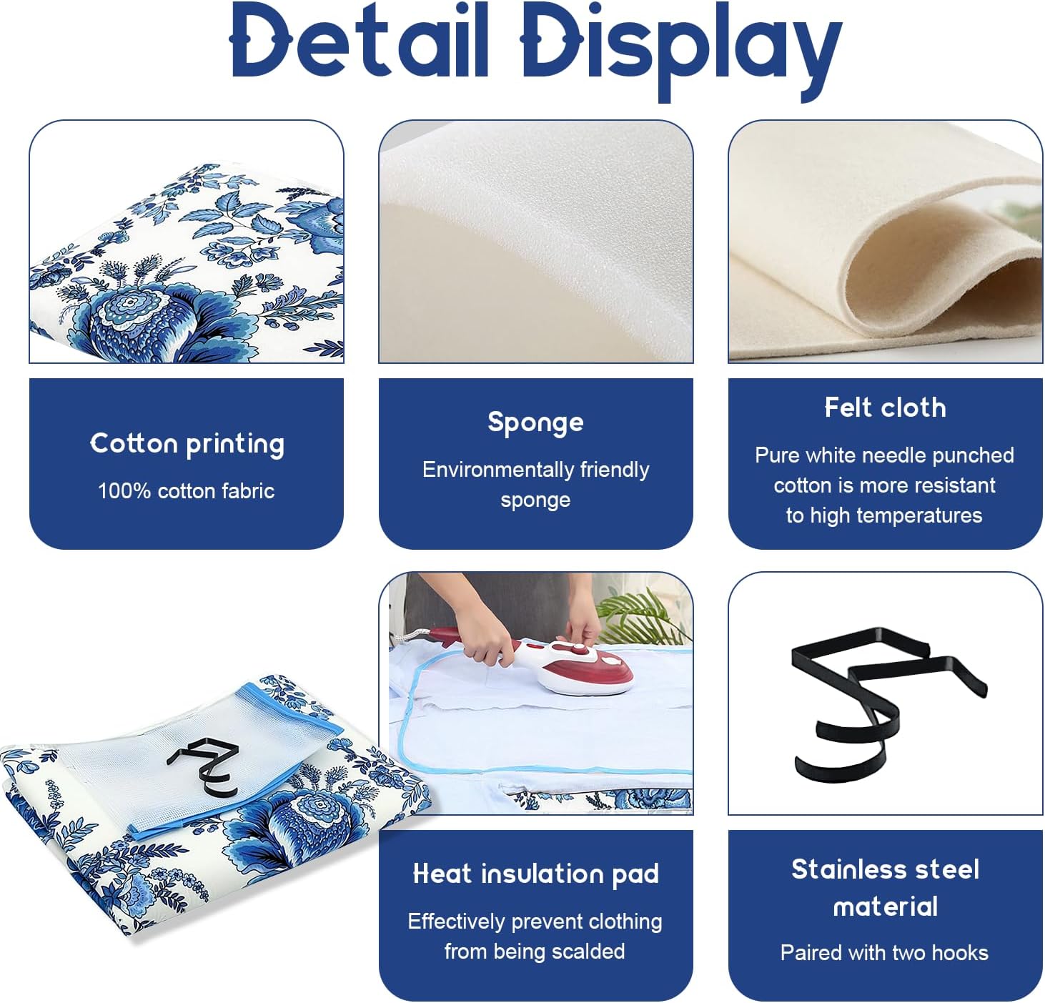 • Quality:Features pure cotton printed fabric laminated to a 3mm fiber pad for soft, efficient ironing. The scorch-resistant fabric prevents discoloration, while the padded core protects tables or beds from heat damage, allows full steam penetration, and retains warmth for faster wrinkle removal.Please do not use this product on expensive desktops or surfaces.