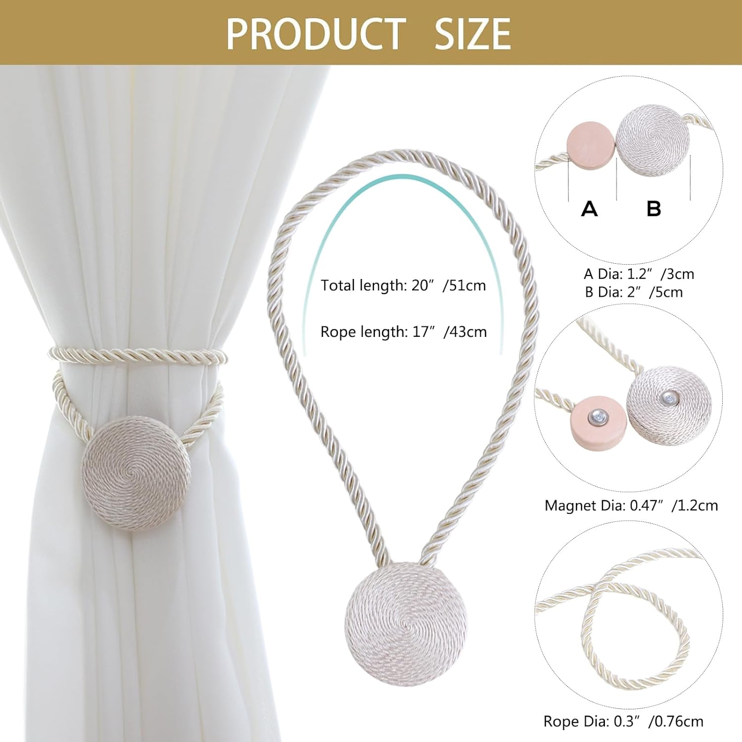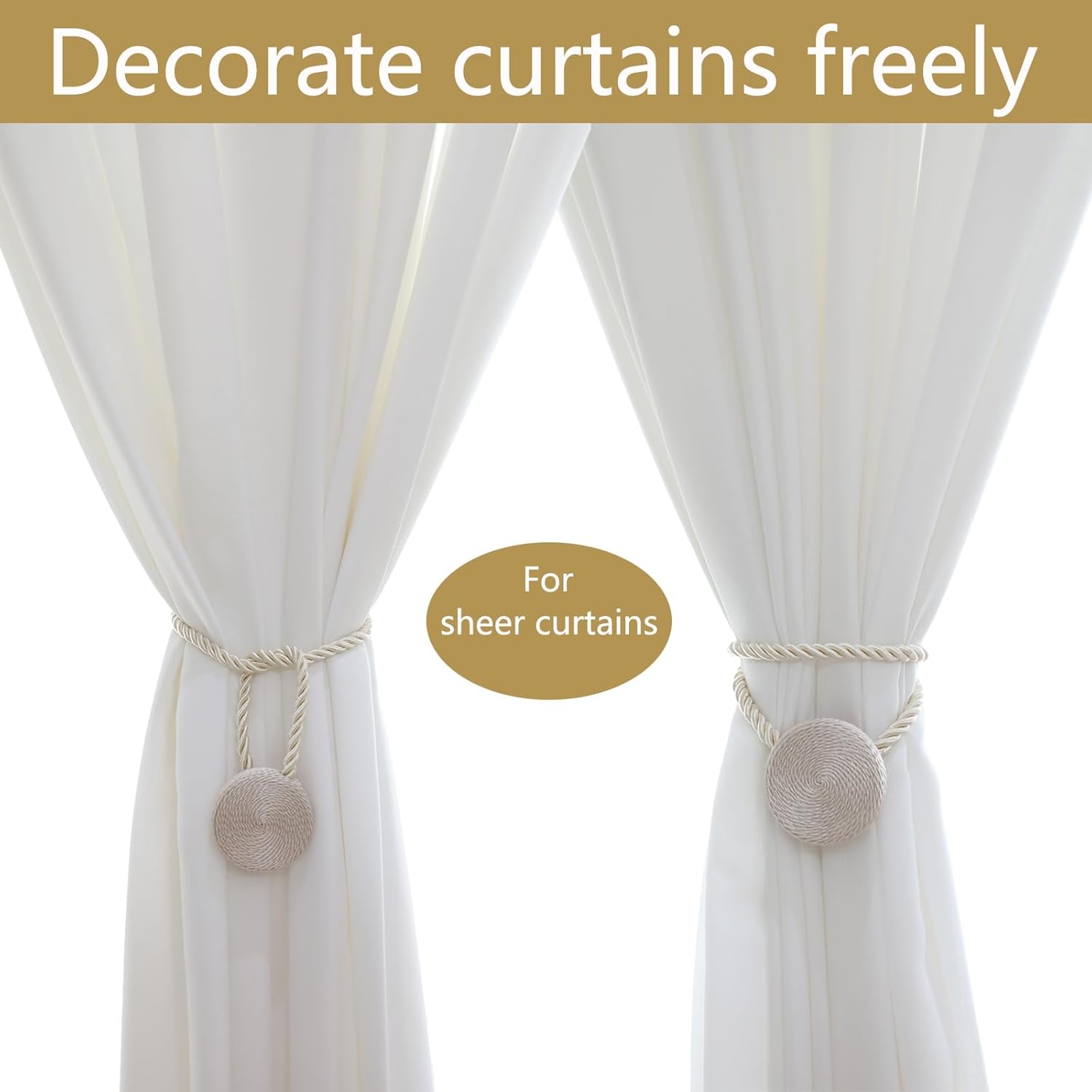 Magnetic Curtain Tiebacks - 12mm Magnetic Tie Backs for Curtains, Heavy Duty No Drill Curtain Holdbacks for Home/Office Windows Drapes, Elegant Gift-Ready Design 7 Colors (2, Beige)