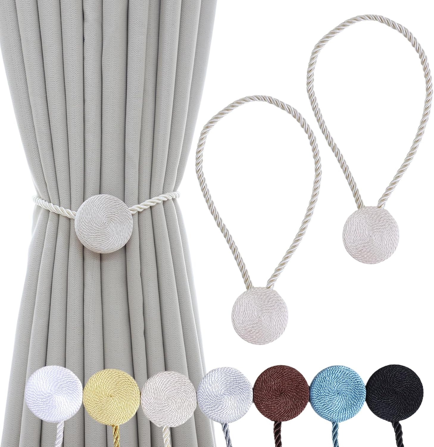 • ⚡️ Zero-Tool Magnetic Curtain Tie backs Installation: Drill-free in 10 seconds! Powerful 12mm magnets clamp curtains securely without wall damage. Attach unused curtain holdbacks anywhere on drapes – never lose them. Sleek circular design with light-reflective rope for minimalist elegance that elevates any room instantly.