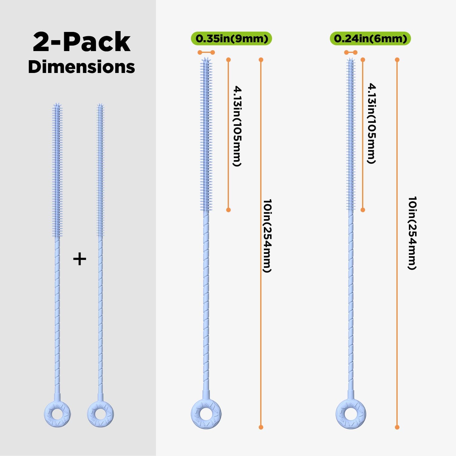• Double Size & Extended Bristles: Two brush diameters (6mm & 9mm) with a total length of 10in. The silicone bristles extend up to 4.13in, reaching deep inside straws for a thorough clean.
