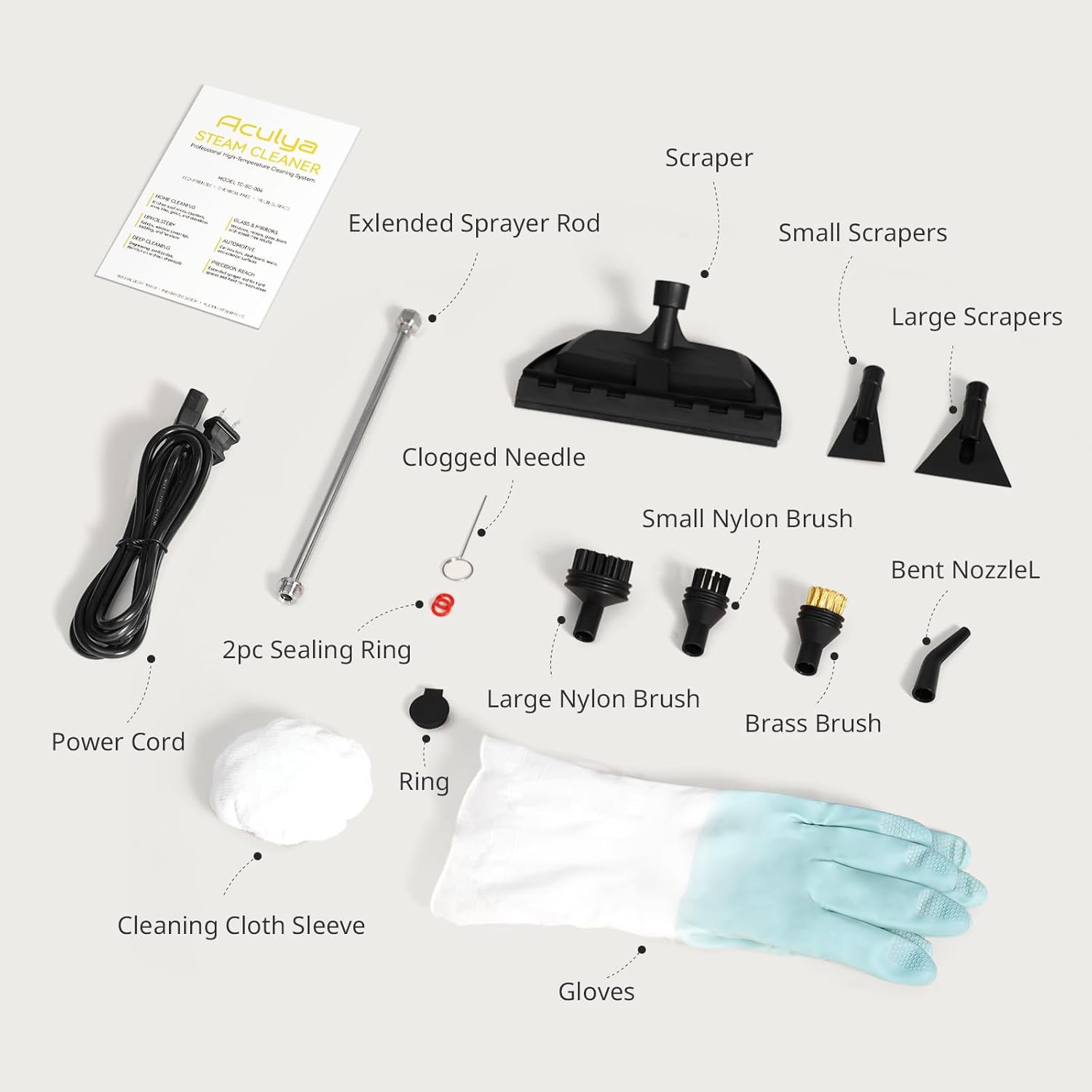 • You can get: 1 x grout steam cleaner with tank, 1 x 59" steam pipe, 1 x 78.7" power cord, 1 x window scraper+ rubber Strip, 1 x clogged needle, 1 x extended sprayer rod, 1 x brass brush , 2 x nylon brush,1x cleaning Cloth Sleeve, 1 x bent nozzleL, 2x scrapers, 2 x gloves, 2 x waterproof sealing ring and 1 x user manual.