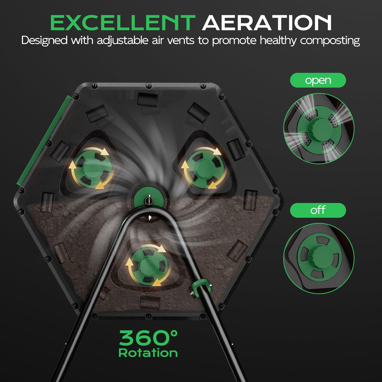 • 【Adjustable Ventilation Control】Optimize decomposition with the adjustable airflow system. This dual chamber compost tumbler features multiple adjustable vents. Easily open/close them to manage moisture, oxygen, and temperature. Prevent odors during active phases or retain heat for faster breakdown