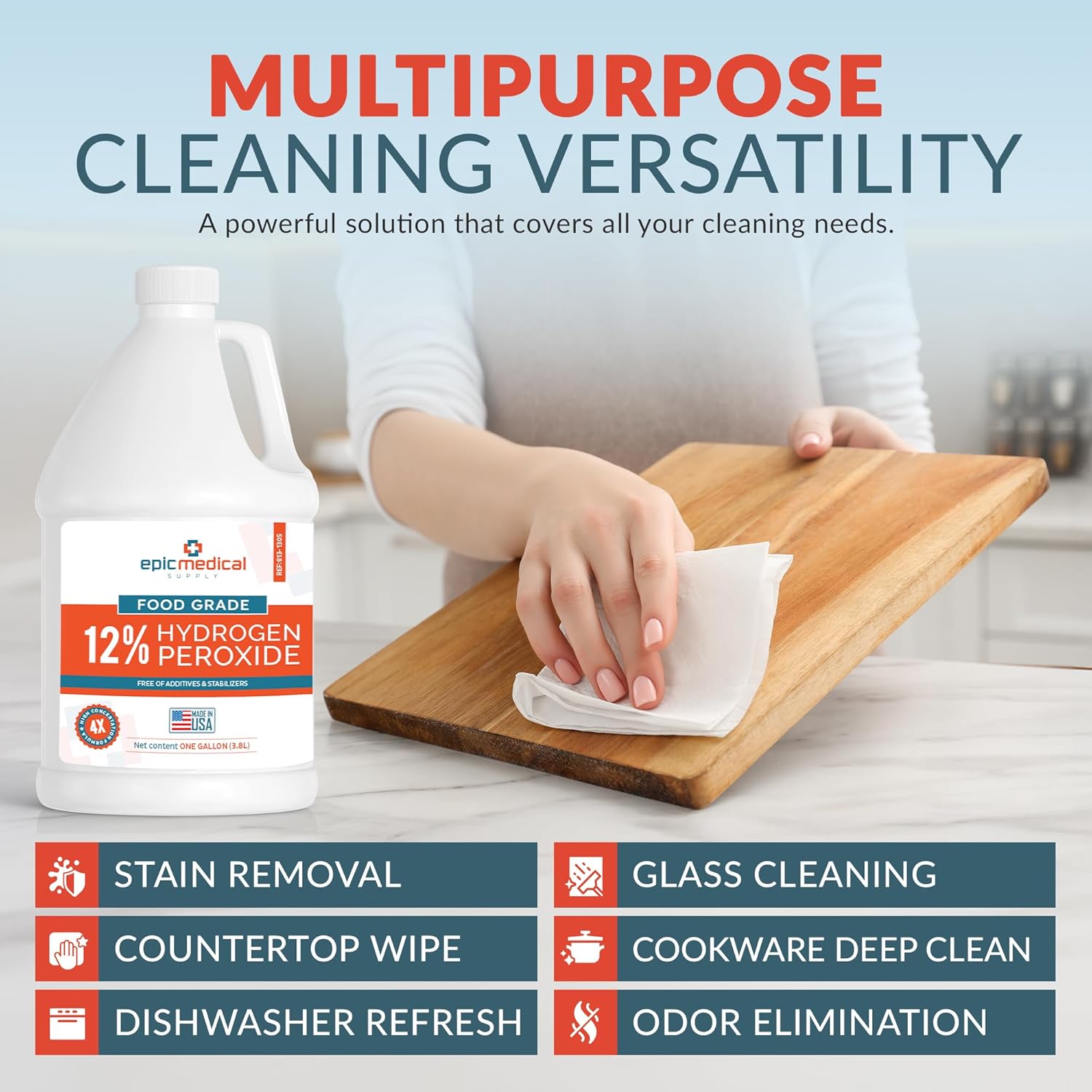 • FOOD-GRADE PURITY WITH NO ADDITIVES – made in the USA using only food-grade hydrogen peroxide and deionized water. This additive-free formula contains no stabilizers, fragrances, or harsh chemicals—offering a clean, straightforward solution for household cleaning tasks where product purity matters most
